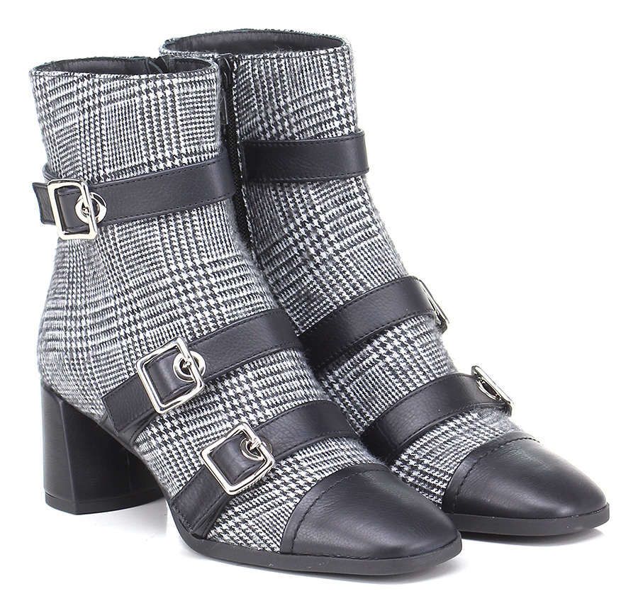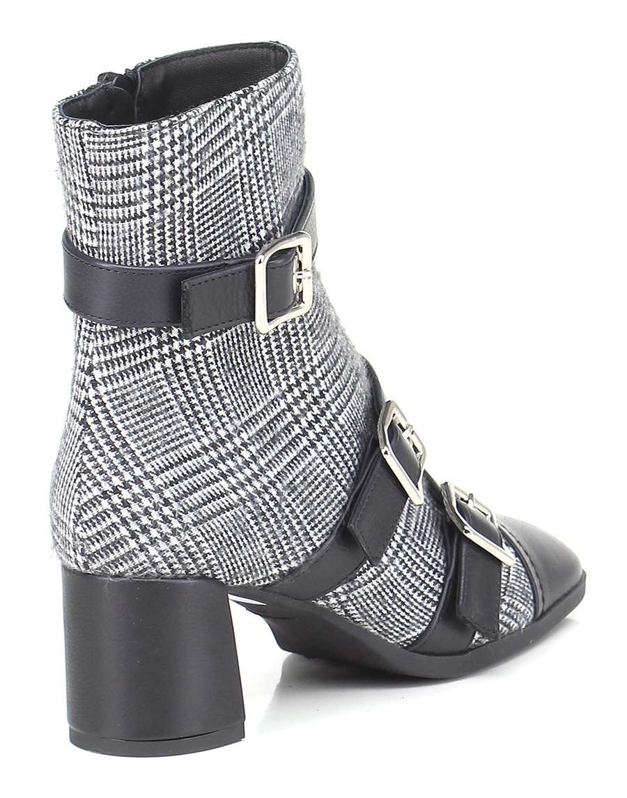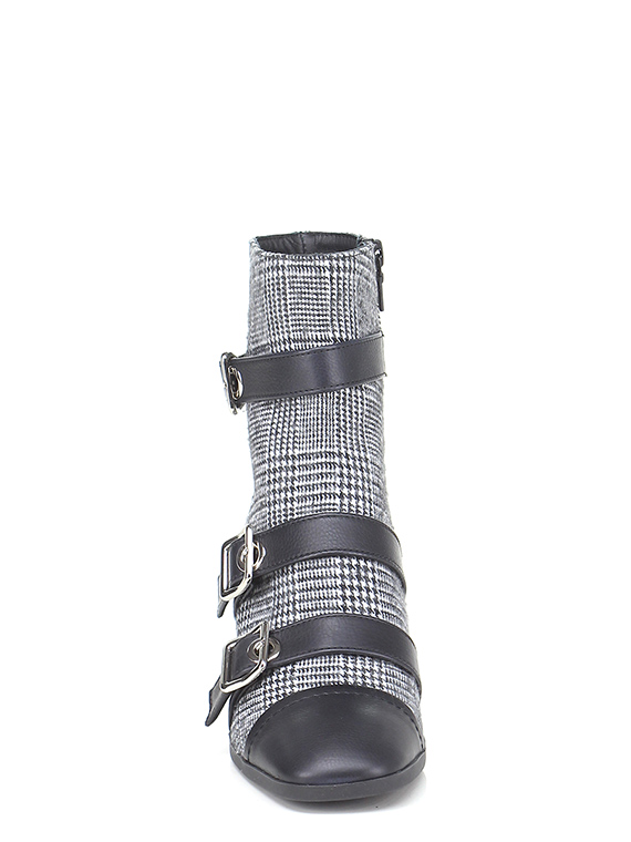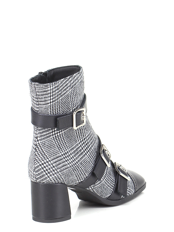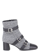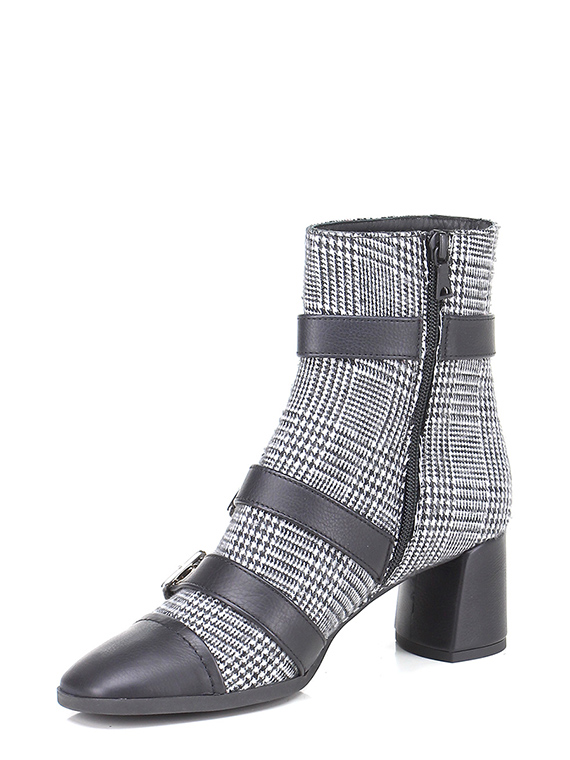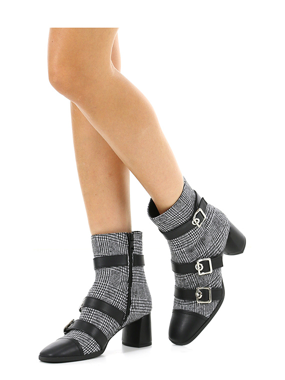 Stiefelette aus Stoff und Leder mit Reißverschluss an der Innenseite und mehreren Riemen vorne. Gummisohle, 60er Absatz.