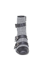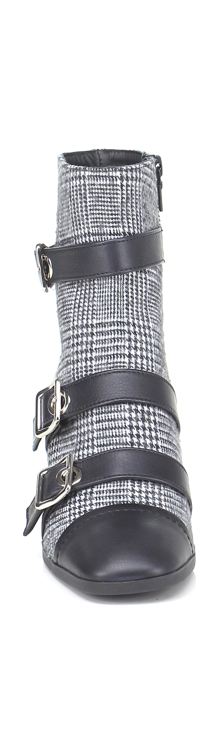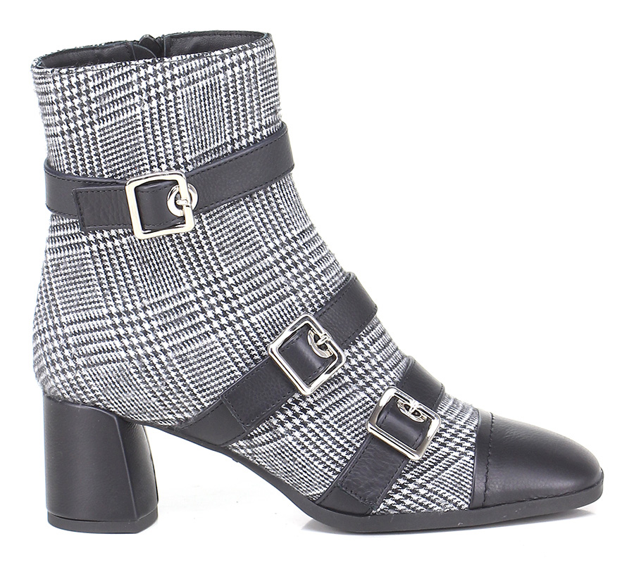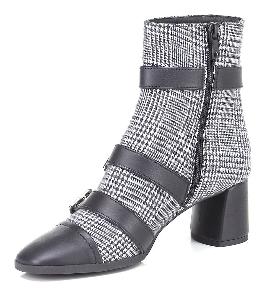 Stiefelette aus Stoff und Leder mit Reißverschluss an der Innenseite und mehreren Riemen vorne. Gummisohle, 60er Absatz.