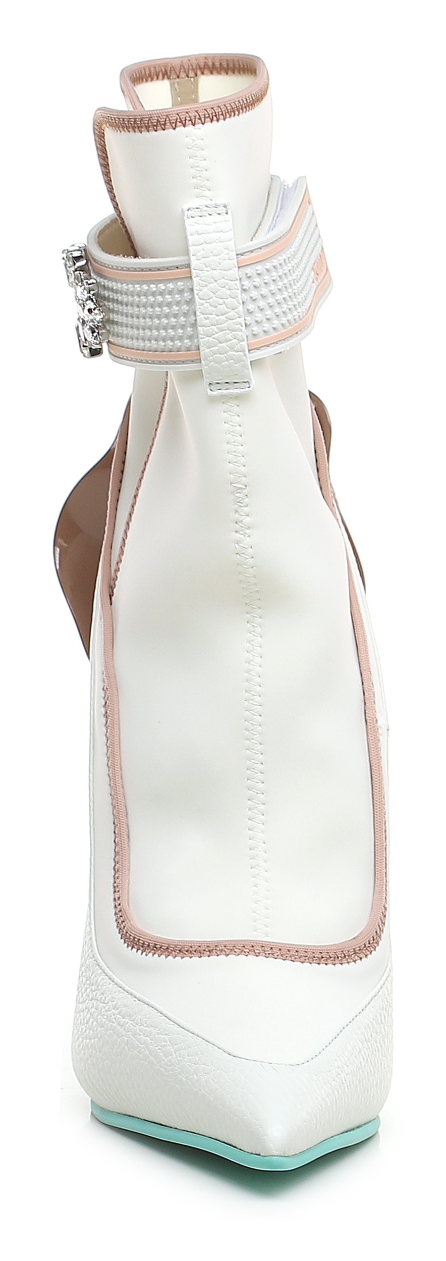 Stiefelette aus Leder und Stretchgewebe mit abnehmbarem PVC-Riemen mit Steinen am Knöchel. Gummisohle. Absatzhöhe 120mm. Absatz aus Metall.