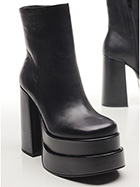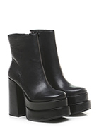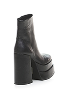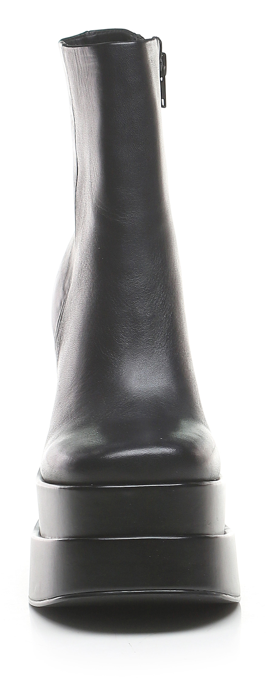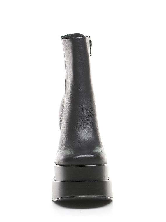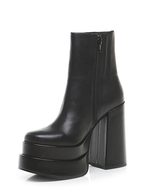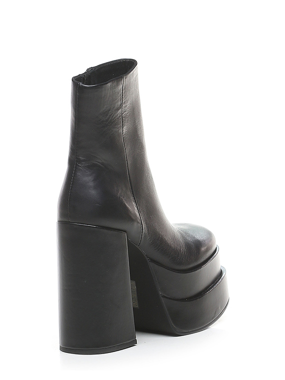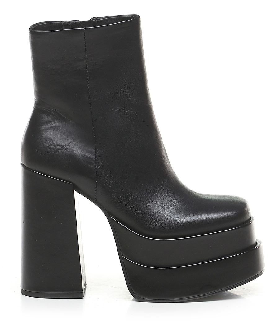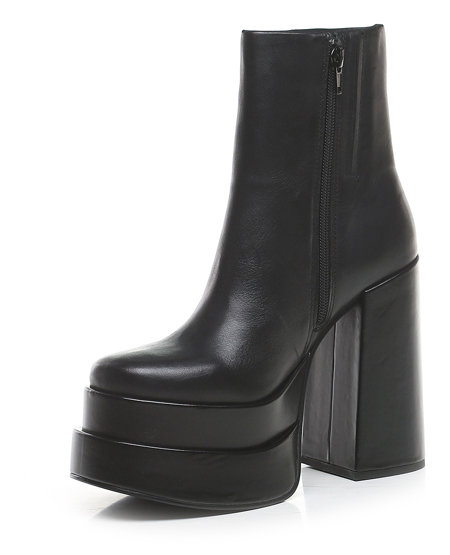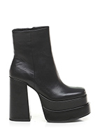 Lederstiefelette mit seitlichem Reißverschluss und Gummisohle. Absatzhöhe 130 mm, Plateau 60 mm mit 70 mm Absatz. Ledergefütterter Absatz.