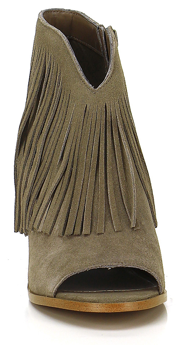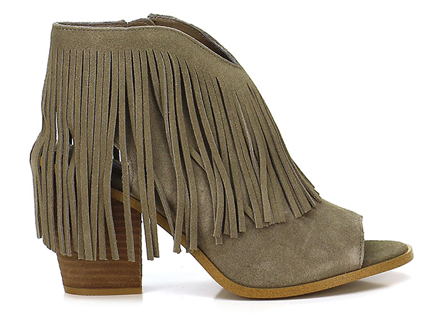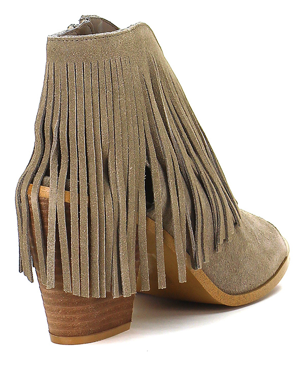 Offene Stiefelette aus Wildleder mit Reißverschluss an der Innenseite und Fransen am Profil. Gummisohle, 100er Absatz, 15er Plateau mit 85er Absatz.