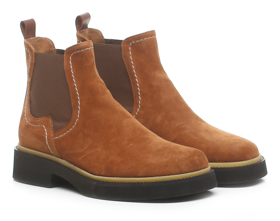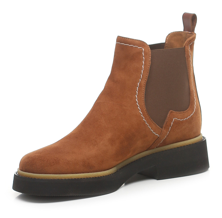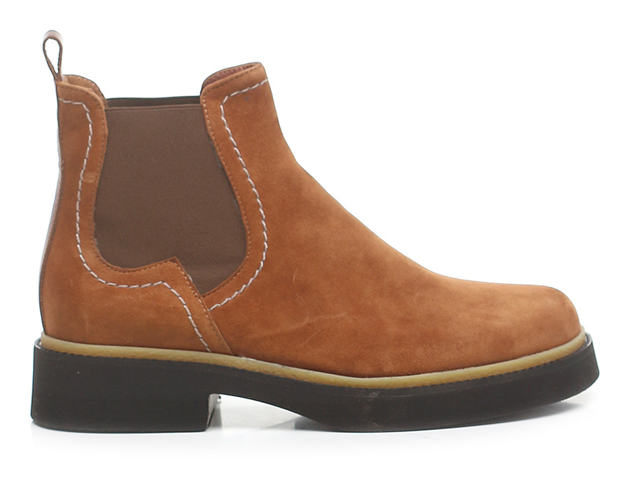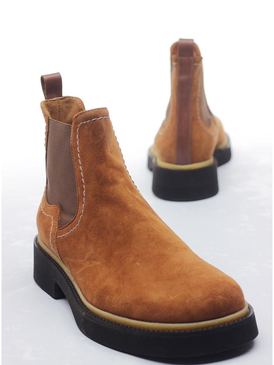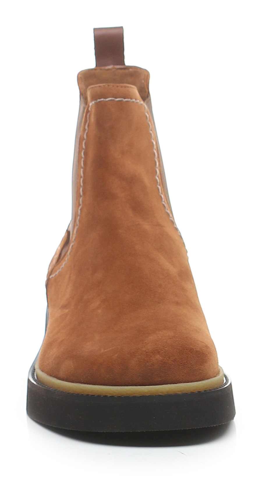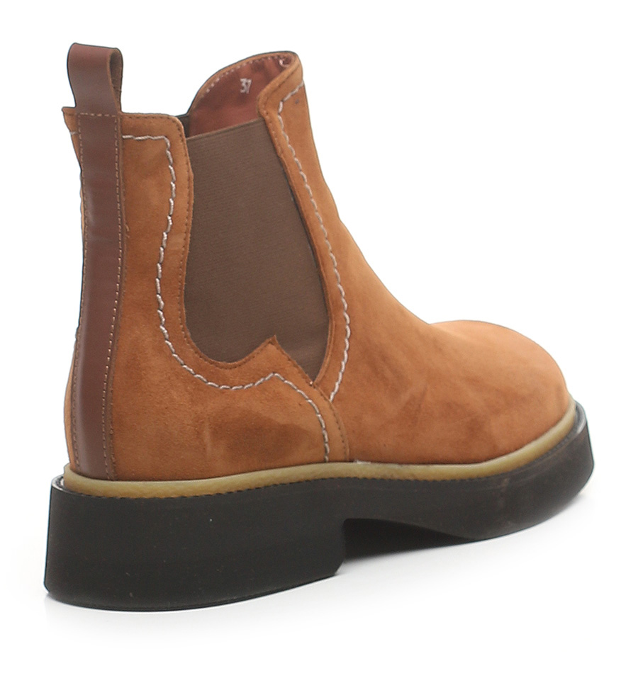 Wildlederstiefelette mit seitlichen elastischen Einsätzen und Gummisohle. 40 mm Absatzhöhe, 25 mm Plateau mit 15 mm Absatz.