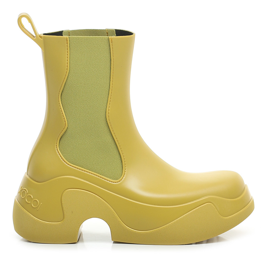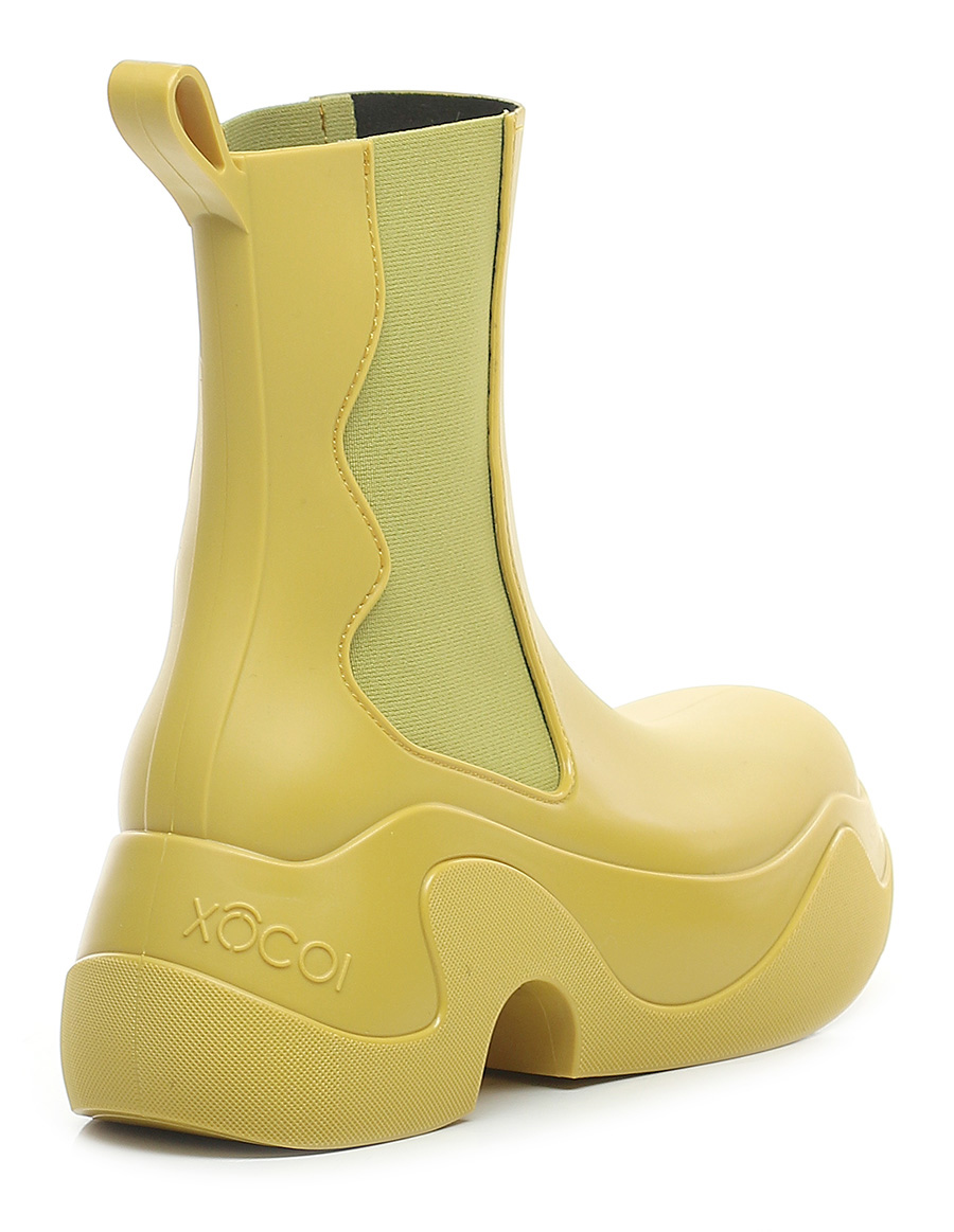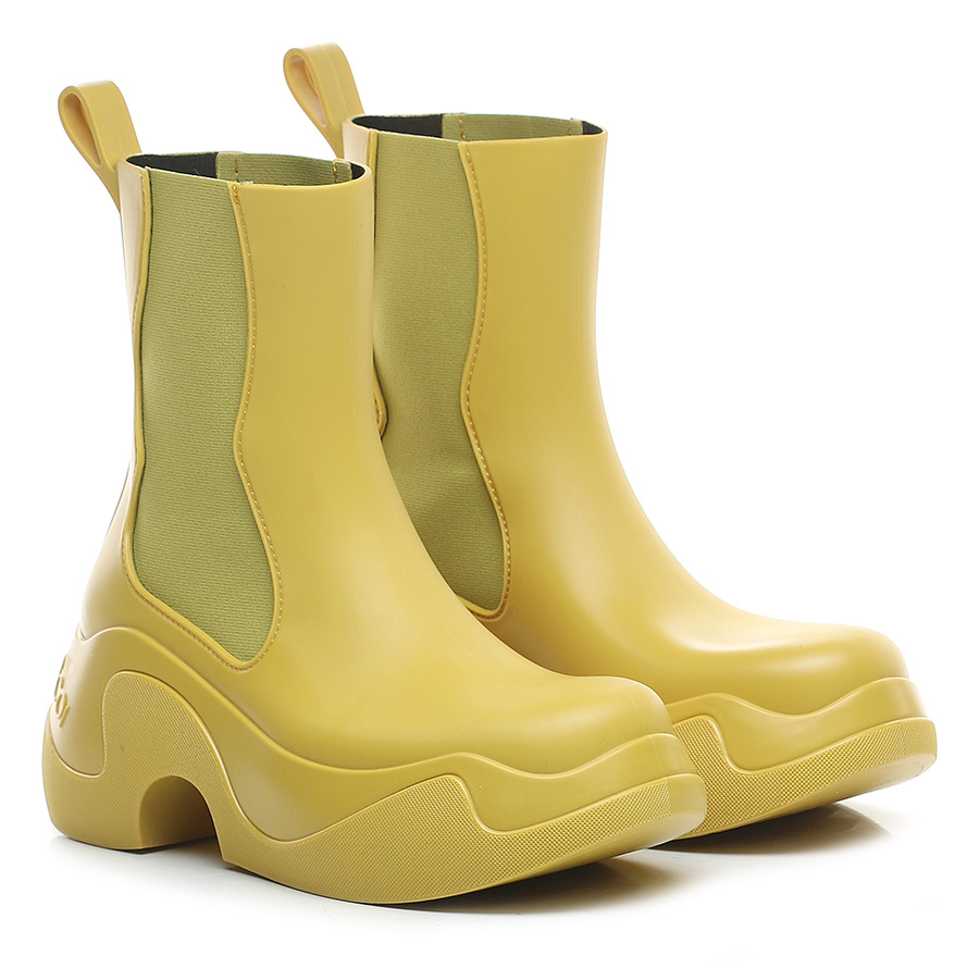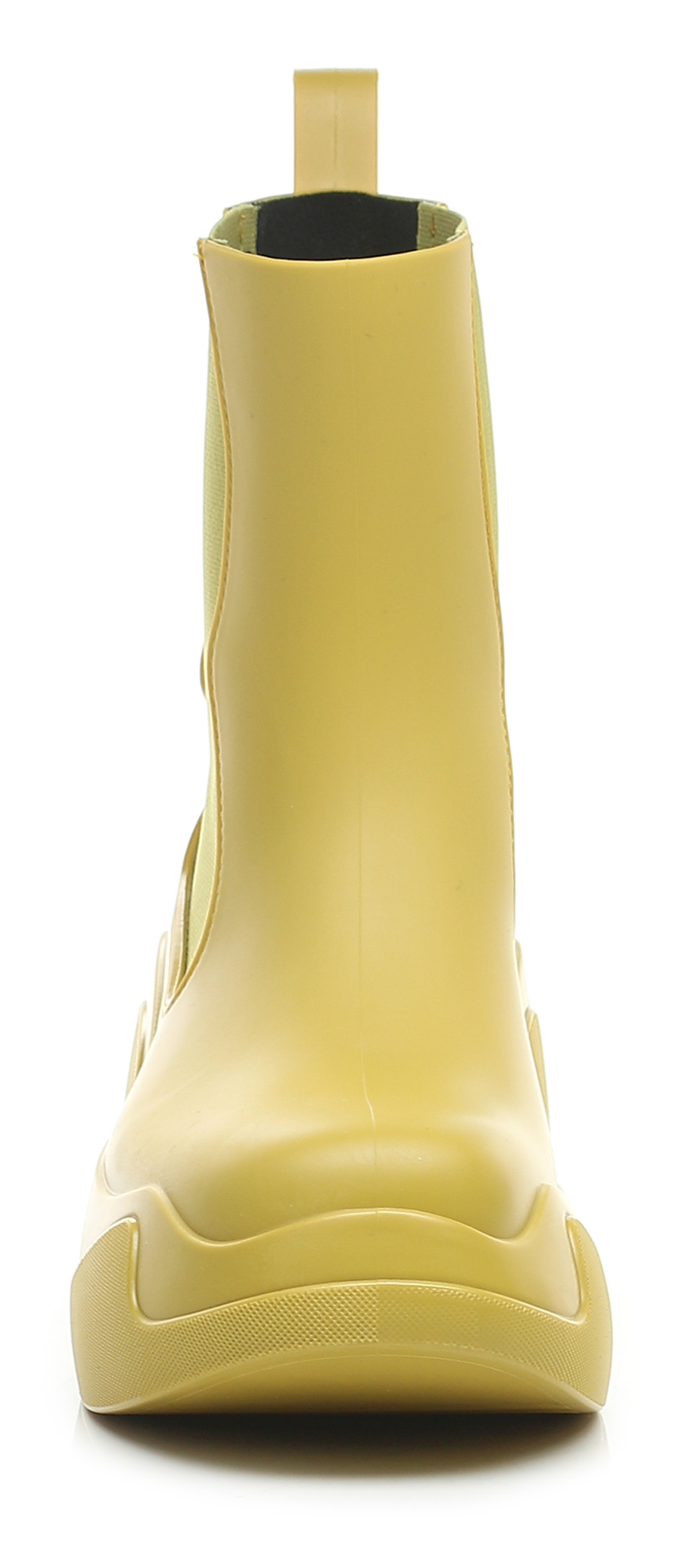 Stiefelette aus recyceltem Gummi mit seitlichen elastischen Einsätzen. Übergroße Gummisohle. 70 mm Absatzhöhe, 45 mm Plateau mit 25 mm Absatz.