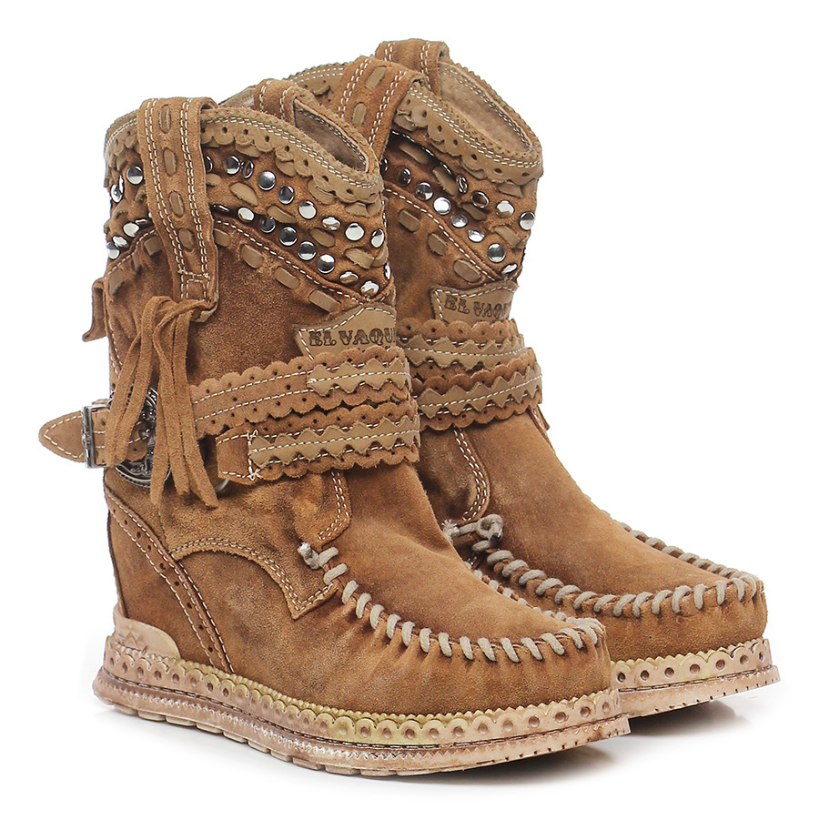 Tronchetto in camoscio,cinturino alla caviglia a incrocio frontale con fibbia stampata e applicazioni di borchie su tomaia, suola in gomma. Tacco 30, platform 20 con battuta 10. Zeppa interna 50, frange ambo lati. Calza abbondante.