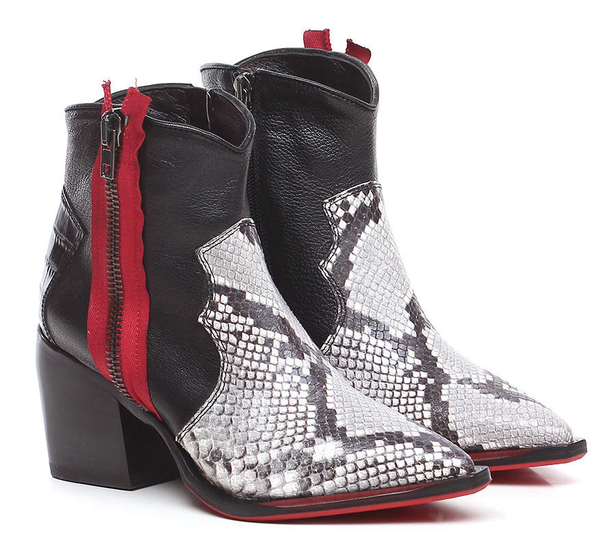 Tronchetto in pelle, pelle stampa pitone, pelle stampa coccodrillo e suola in cuoio e gomma. Zip laterale interno, applicazione finta cerniera in tessuto lato esterno. Tacco 80, platform 15 con battuta 65.