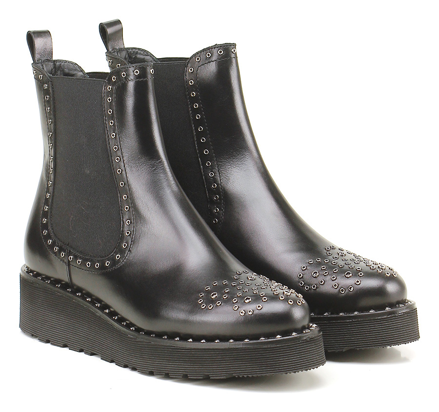 Tronchetto in pelle con inserti elasticizzati su ambo i lati e borchie su tomaia. Suola in gomma light, tacco 40, platform 30 con battuta 10.
