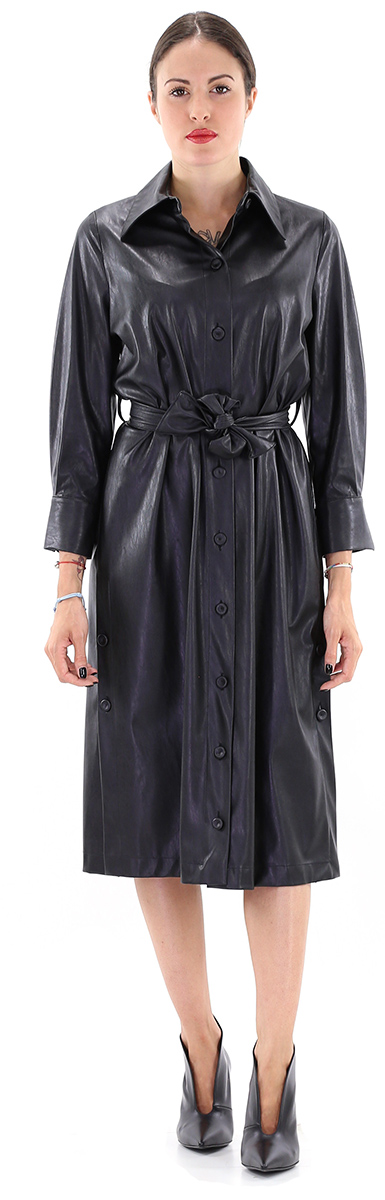 Abito chemisier in ecopelle, a maniche lunghe e collo classico. Cintura inclusa in ecopelle. La modella è alta 1,68 ed indossa la taglia XSS.