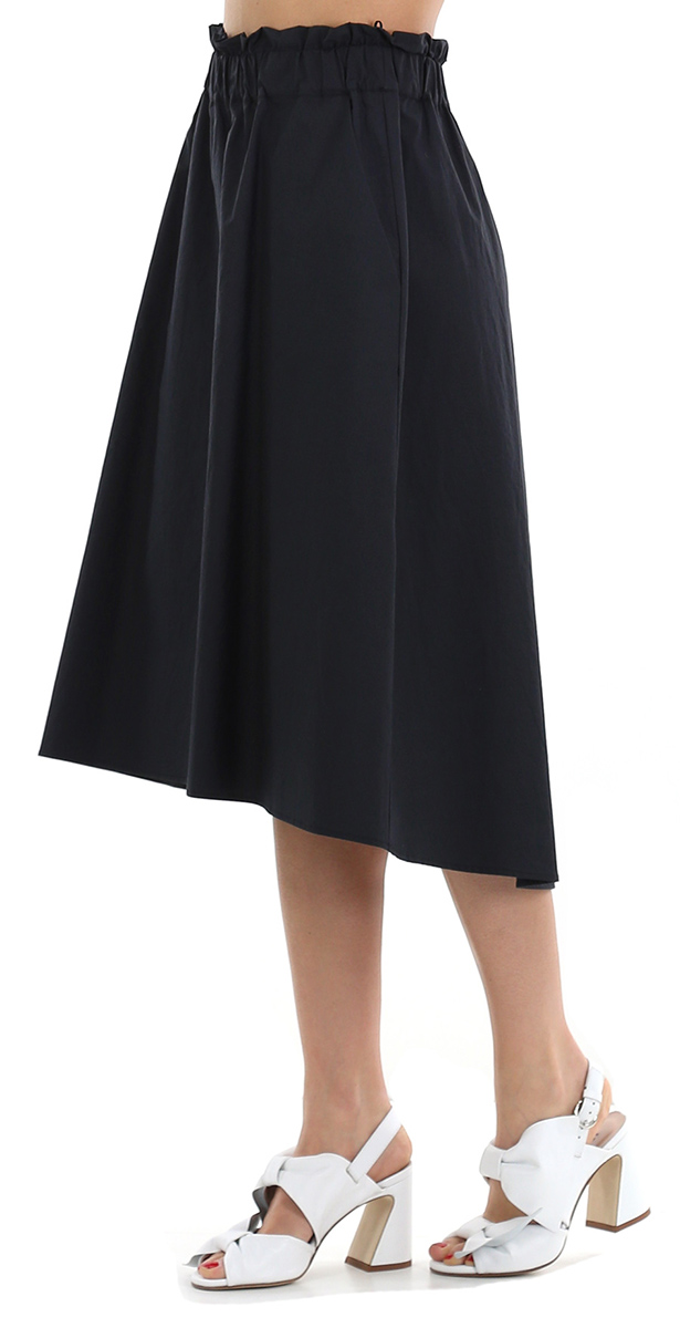 Gonna 100% cotone con tasche all'americana ed elastico in vita. Fondo asimmetrico. La modella è alta 1.68 ed indossa la taglia 38.
