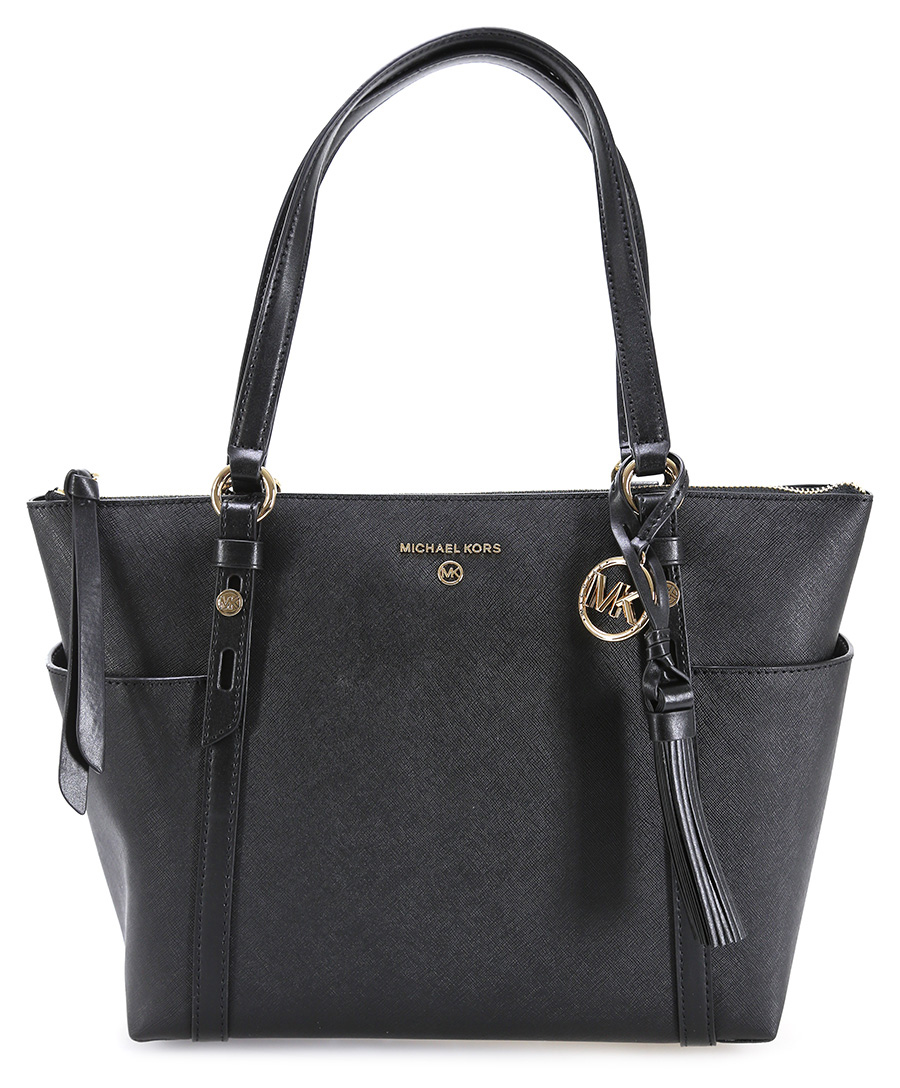 Borsa in pelle saffiano con chiusura zip. Charms inclusi. Tasche esterne. Misure 31 x 25 cm. Dettagli gold.
