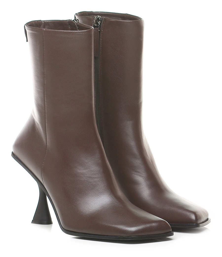 Tronchetto in pelle con zip laterale. Suola in cuoio. Tacco in pvc a rocchetto. Altezza tacco 90mm.