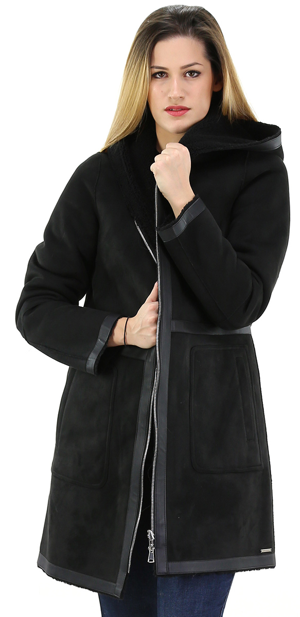 Giacca eco-montone con profili in eco-pelle a maniche lunghe e cappuccio. Tasche applicate e zip di chiusura frontale. La modella è alta 1.75 ed indossa la taglia S.