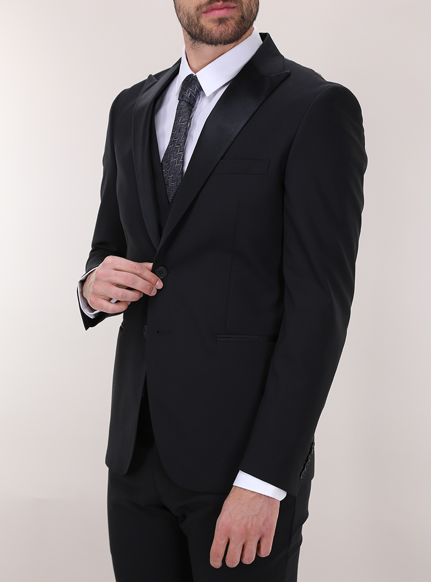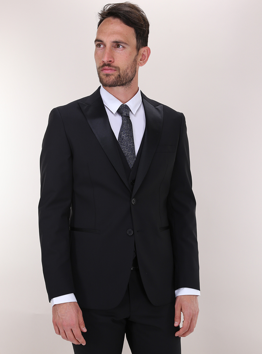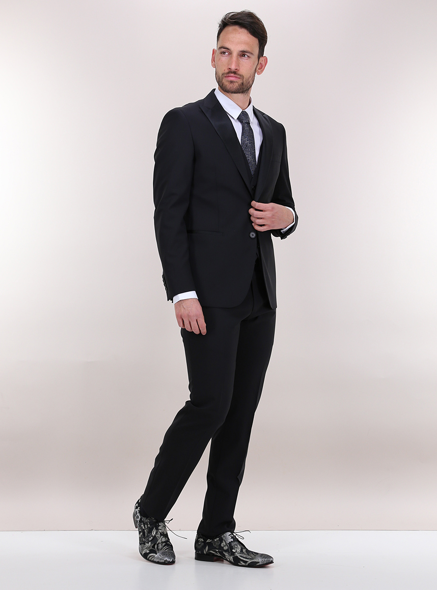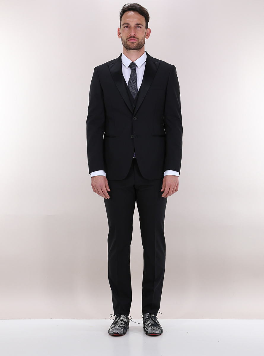 Maßgeschneiderter Tonello-Smoking aus kühler Stretch-Wolle. Jacke mit langen Ärmeln und steigendem Revers aus Satin. Verschluss mit zwei Knöpfen und Leistentaschen vorne. Rückenschlitz. Schmal geschnittene Hose mit seitlichen Eingrifftaschen und Paspeltaschen auf der Rückseite. Das Model ist 180 groß und trägt Größe 48.