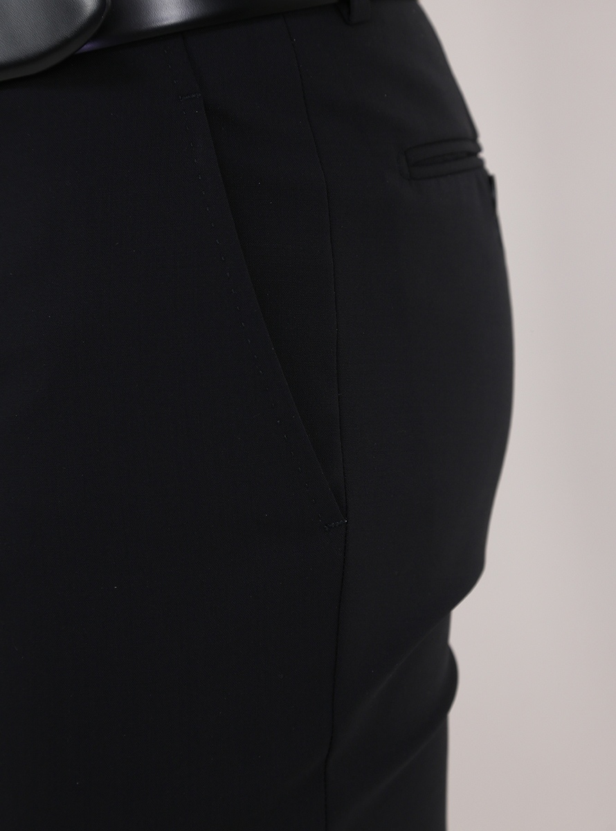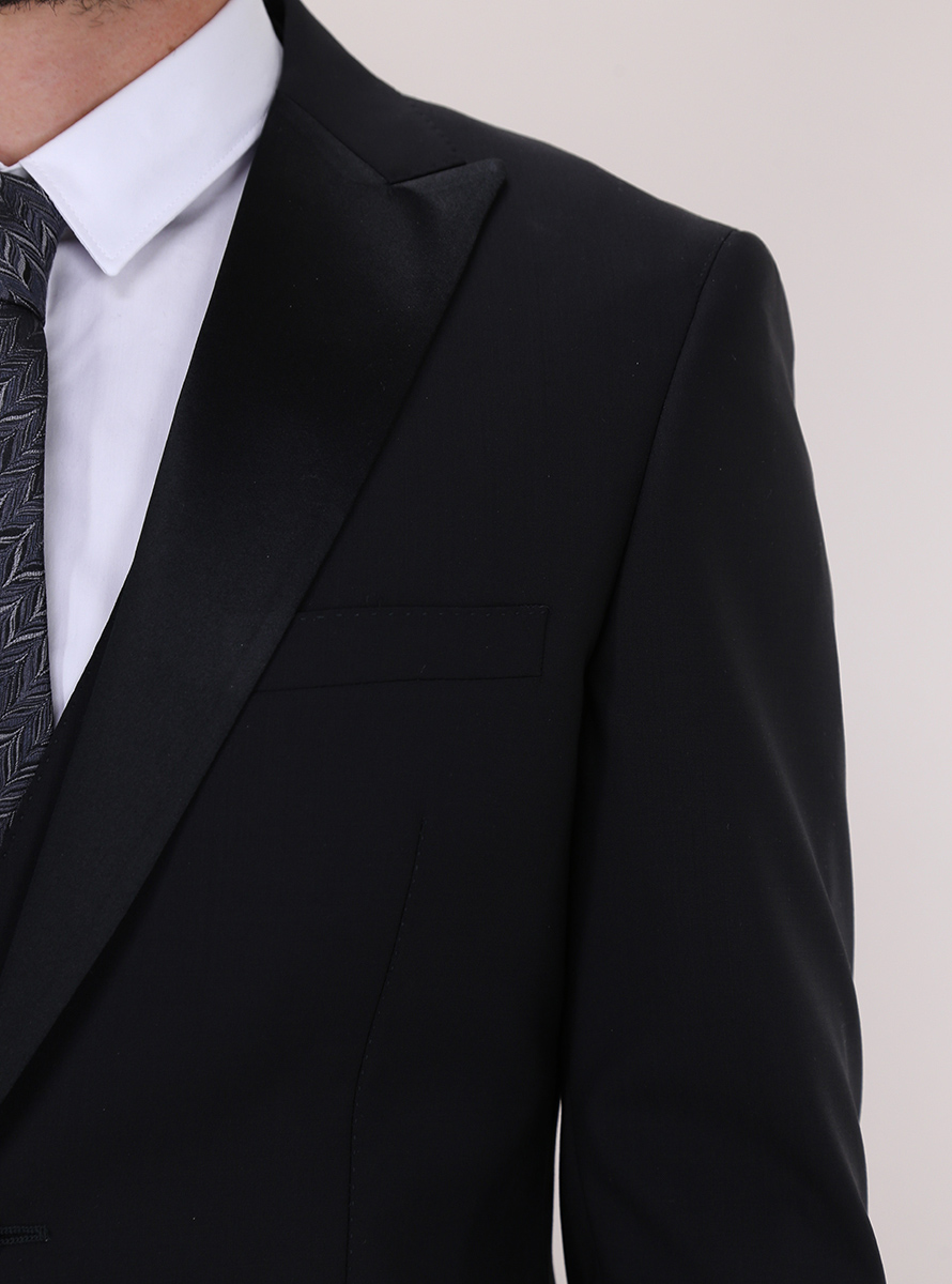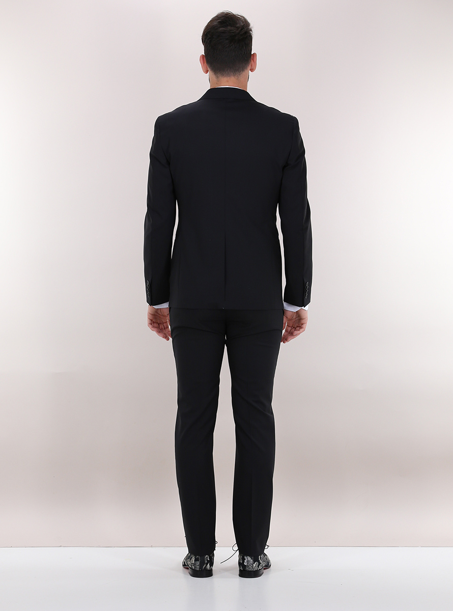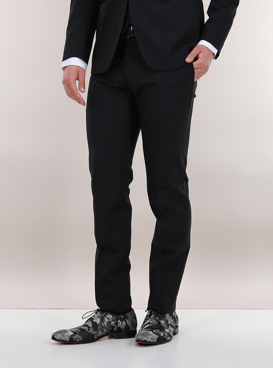Maßgeschneiderter Tonello-Smoking aus kühler Stretch-Wolle. Jacke mit langen Ärmeln und steigendem Revers aus Satin. Verschluss mit zwei Knöpfen und Leistentaschen vorne. Rückenschlitz. Schmal geschnittene Hose mit seitlichen Eingrifftaschen und Paspeltaschen auf der Rückseite. Das Model ist 180 groß und trägt Größe 48.