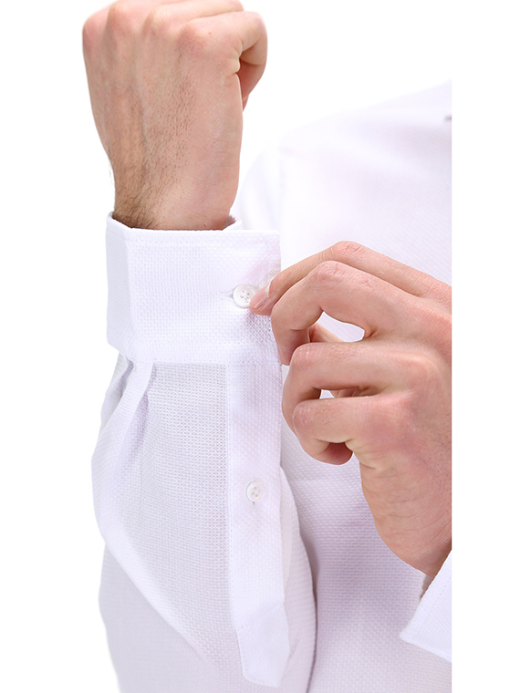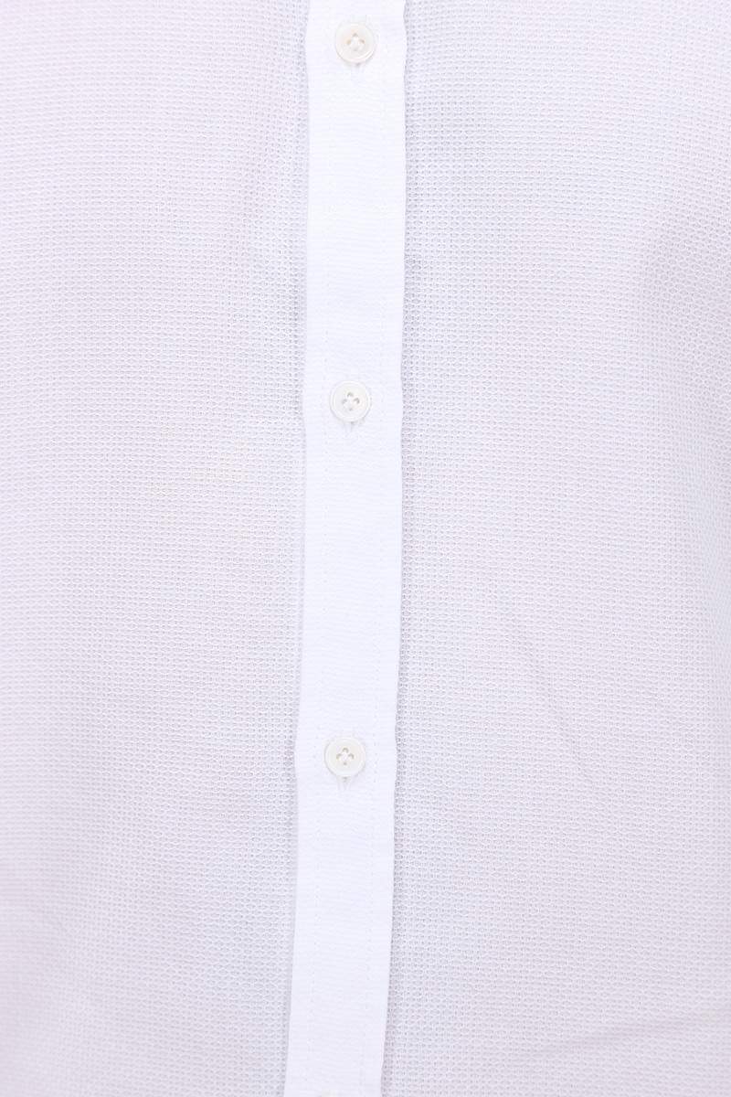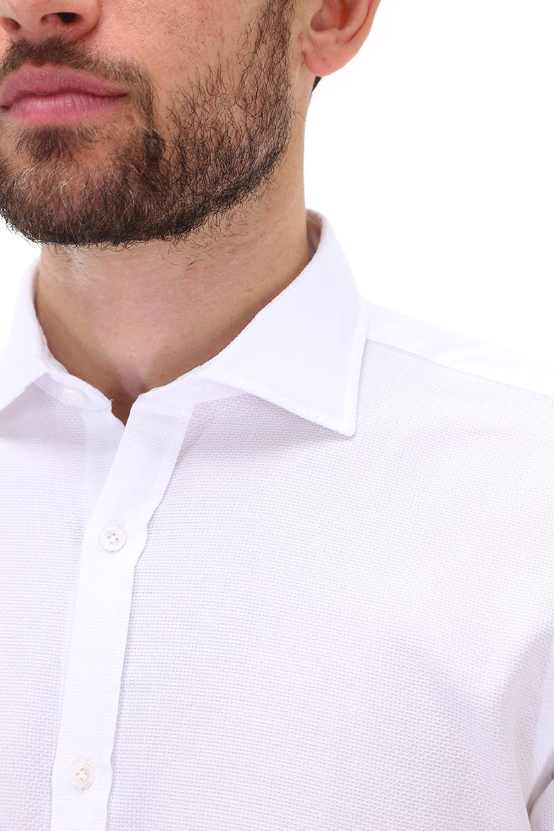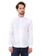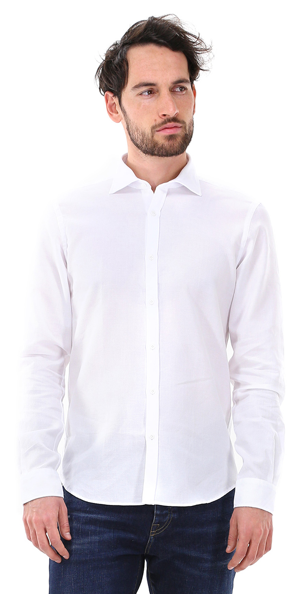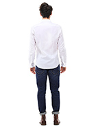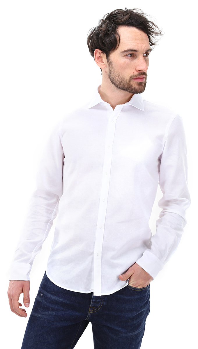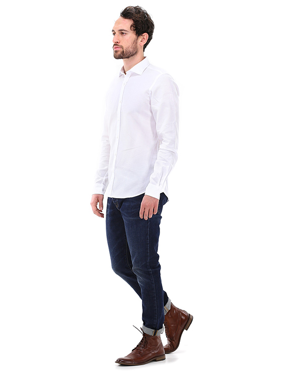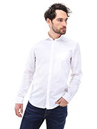 Schmal geschnittenes Oxford-Baumwollhemd. Das Model ist 1,80 groß und trägt Größe 40.