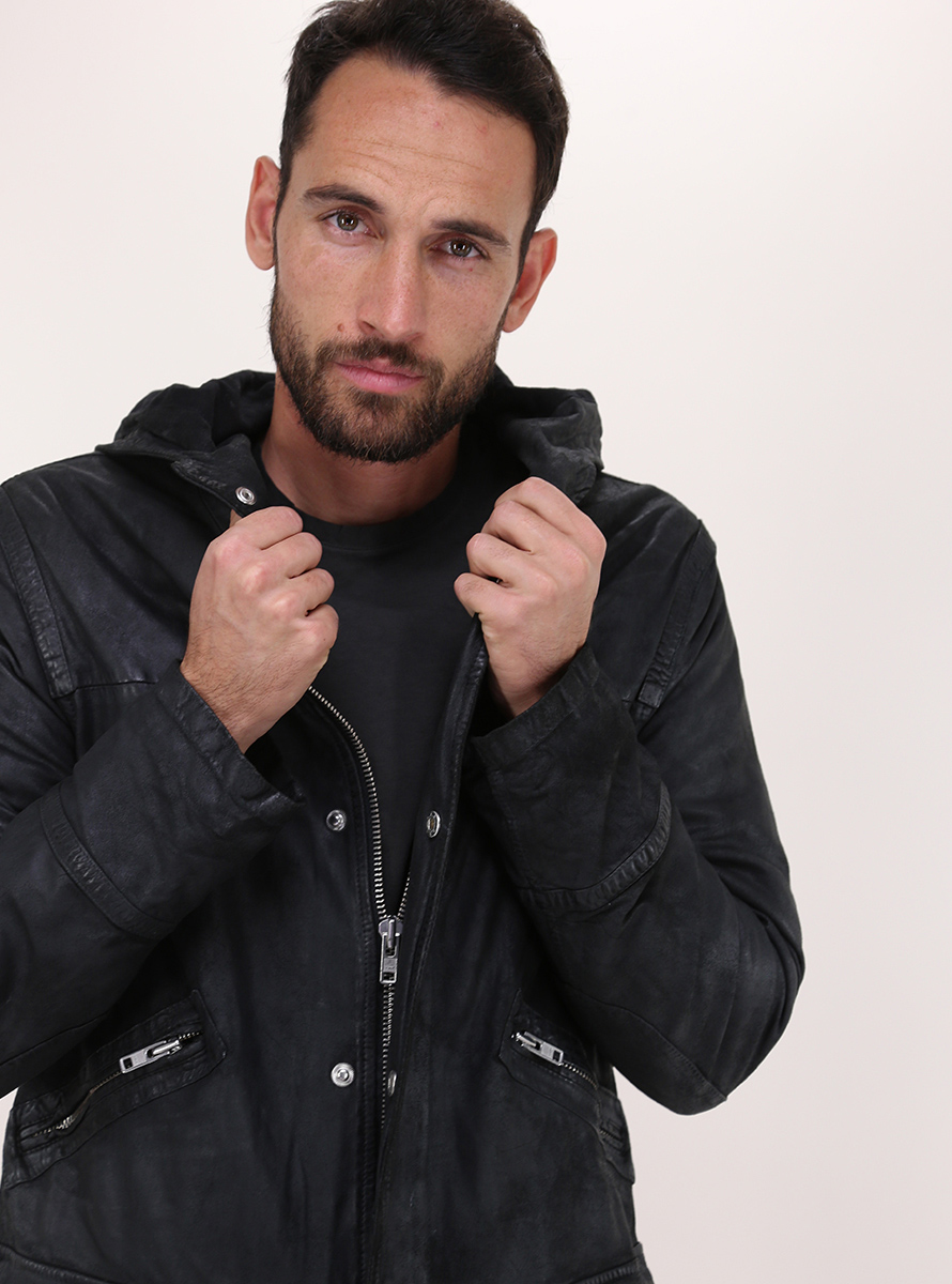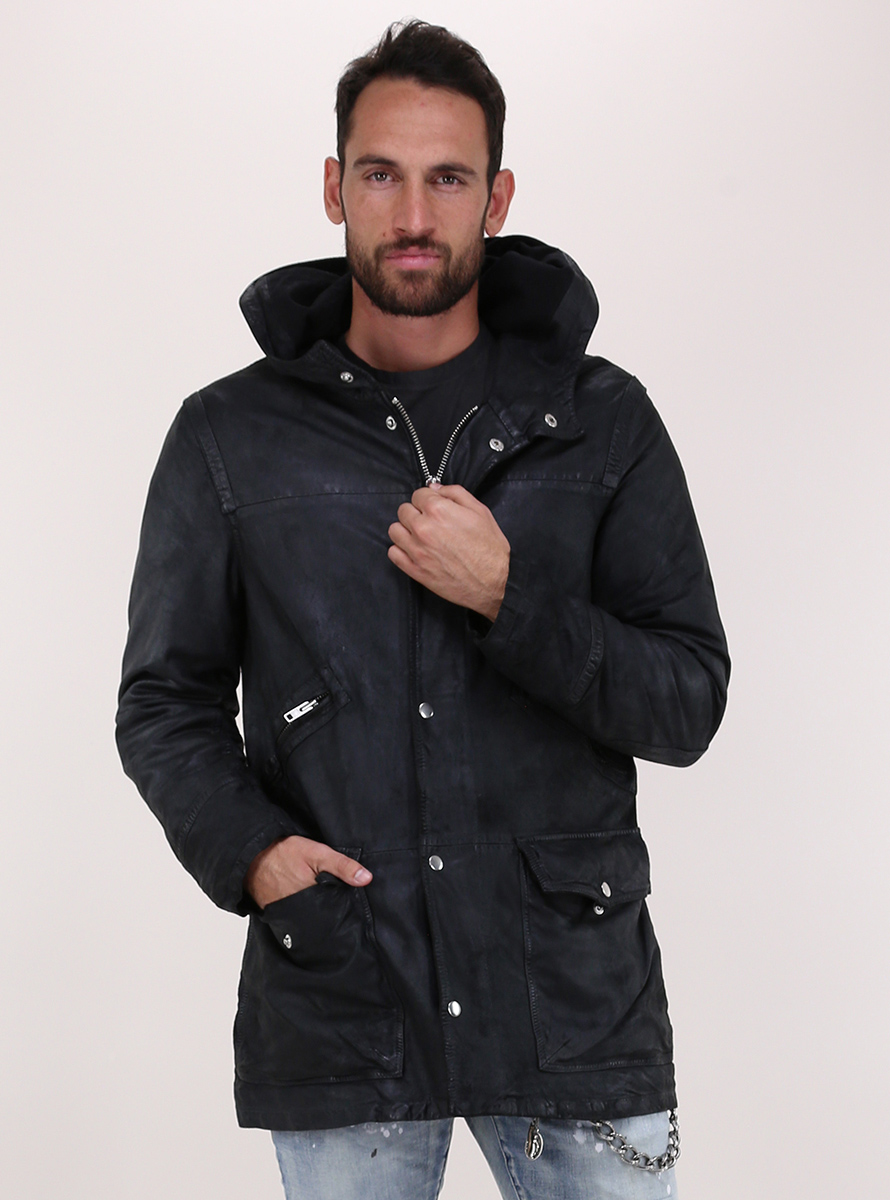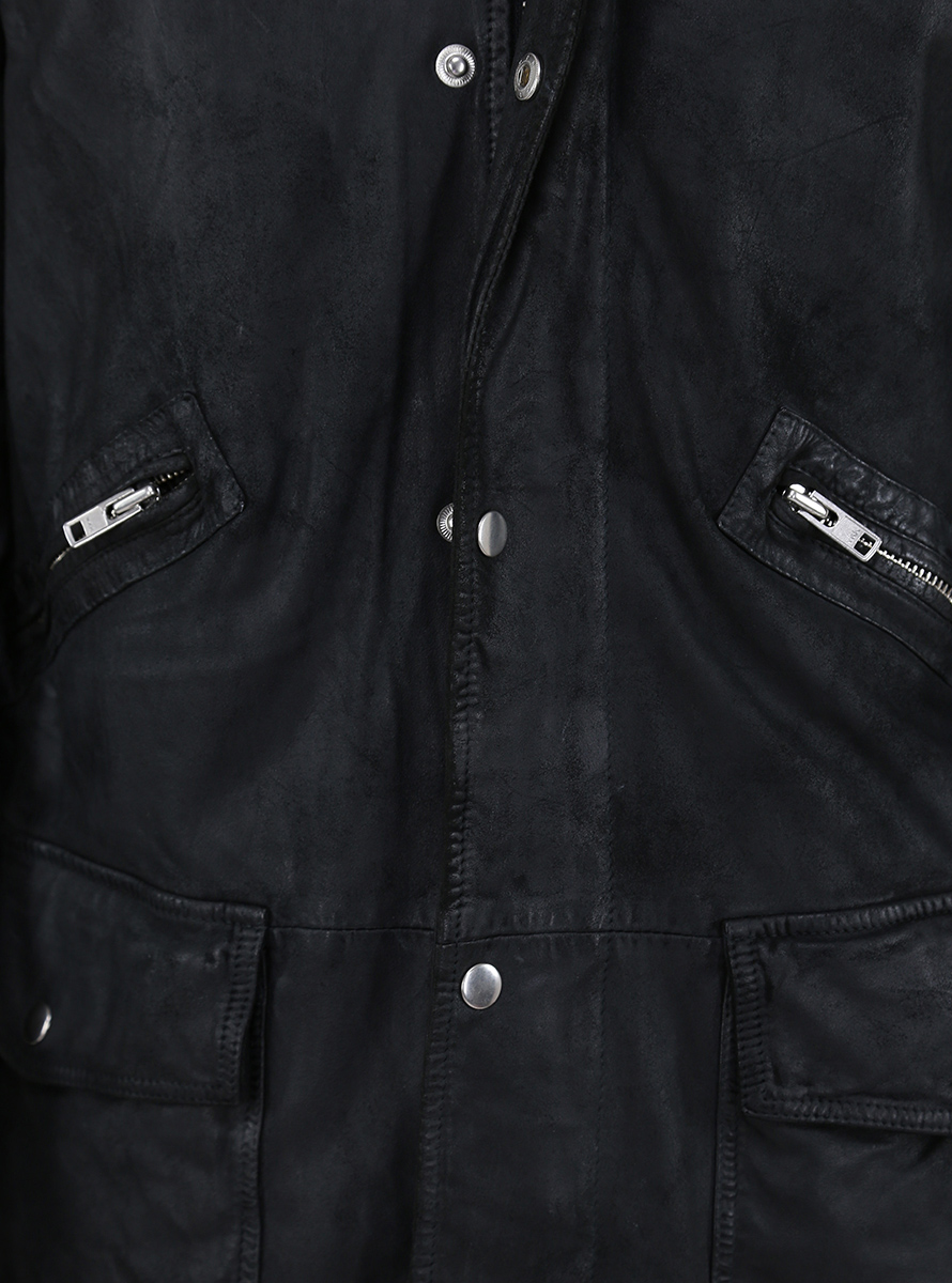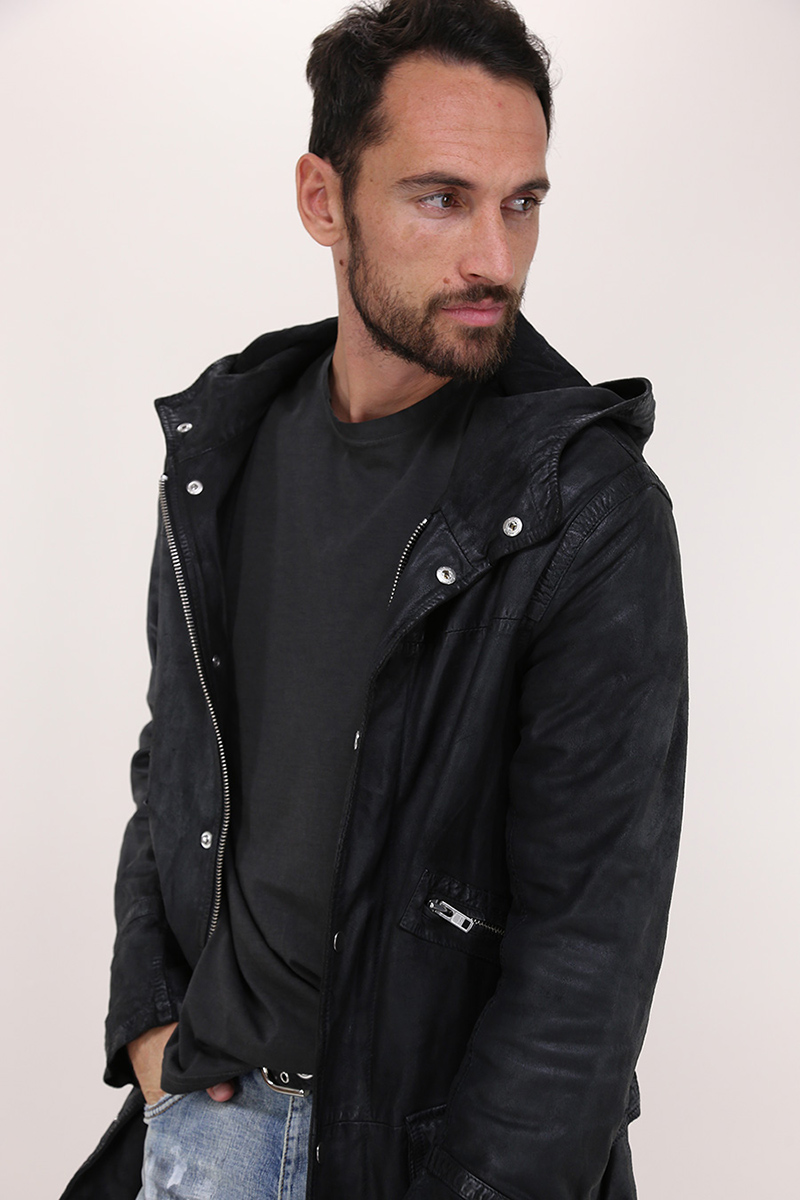Bully-Lederparka mit Baumwollfutter. Lange Ärmel und Wasserfallausschnitt. Frontverschluss mit Doppelreißverschluss und Druckknöpfen. Beuteltaschen vorne und Reißverschlusstaschen. Das Model ist 1,80 groß und trägt Größe 48.