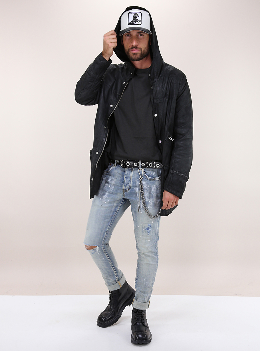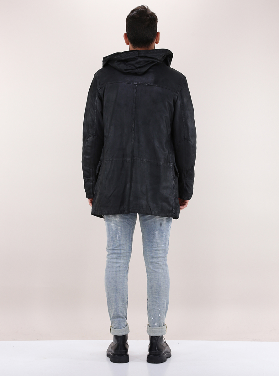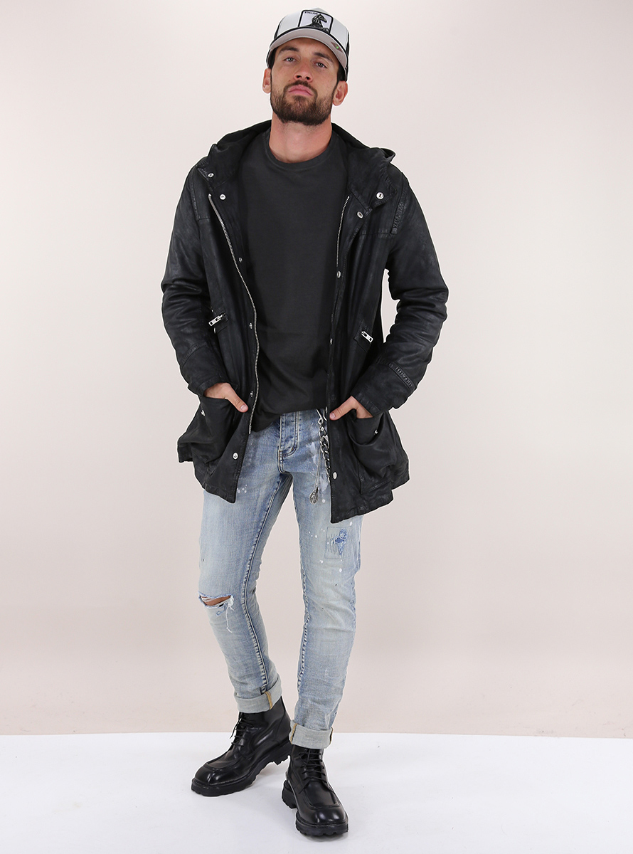 Bully-Lederparka mit Baumwollfutter. Lange Ärmel und Wasserfallausschnitt. Frontverschluss mit Doppelreißverschluss und Druckknöpfen. Beuteltaschen vorne und Reißverschlusstaschen. Das Model ist 1,80 groß und trägt Größe 48.
