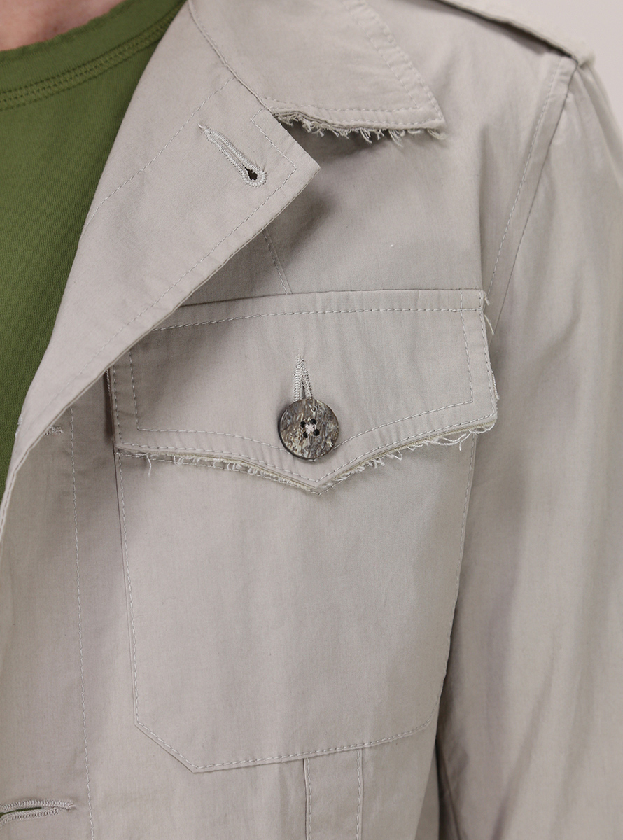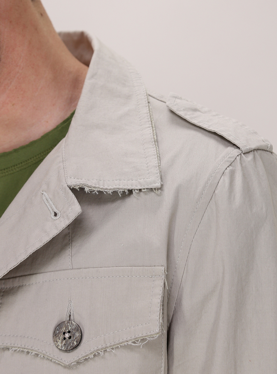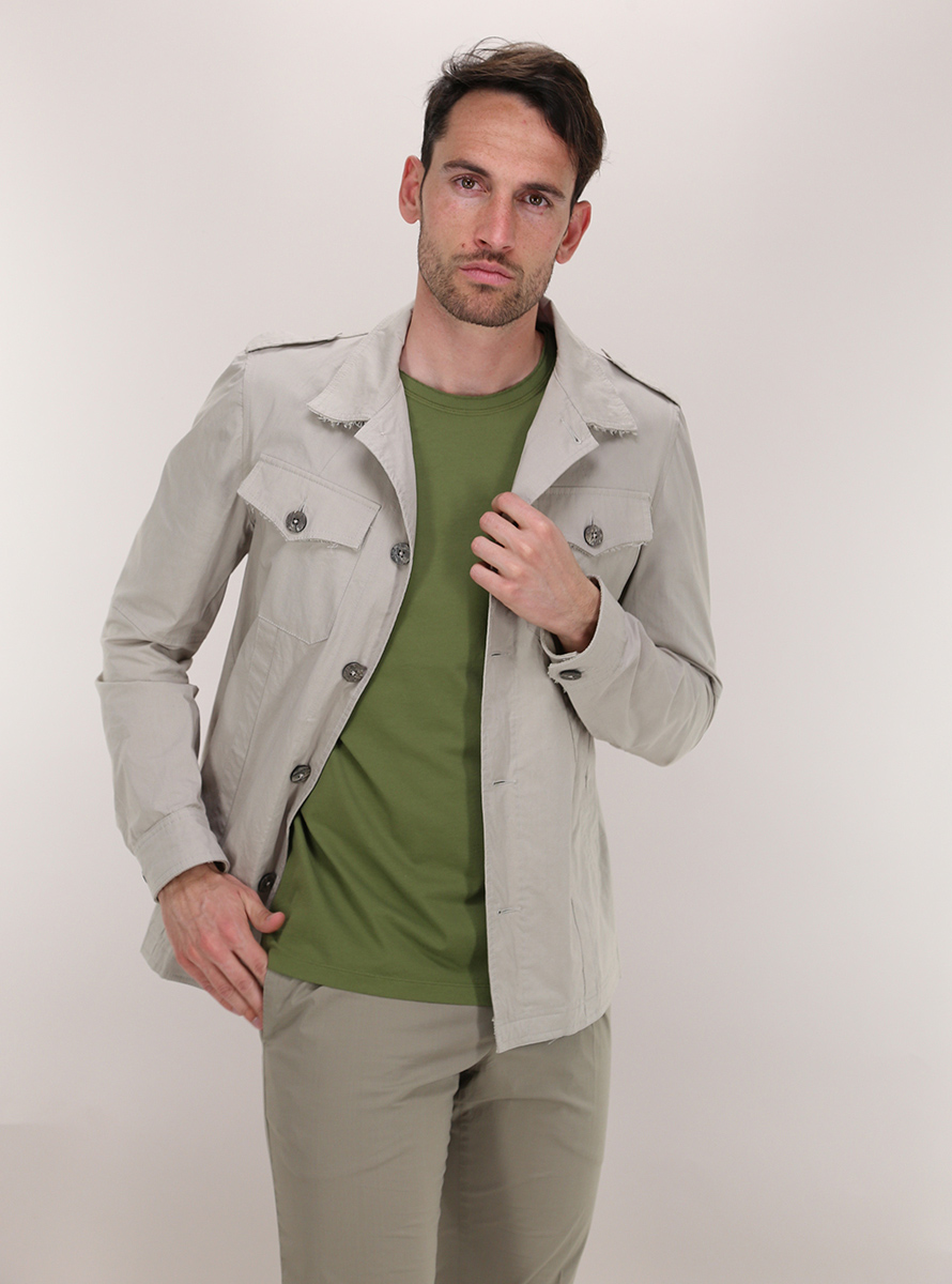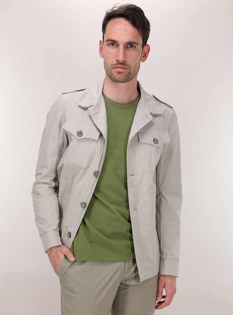 Messaggerie Saharan Jacke aus elastischer Baumwolle mit langen Ärmeln und klassischem Fransenkragen. Aufgesetzte Vorder- und Paspeltaschen. Schulterklappen mit Druckknopf. Das Model ist 1,80 groß und trägt Größe 48.