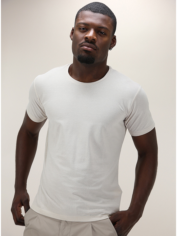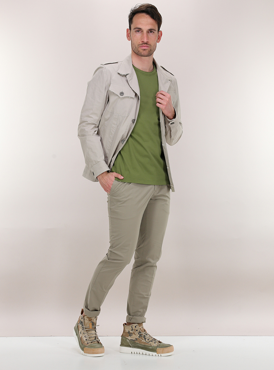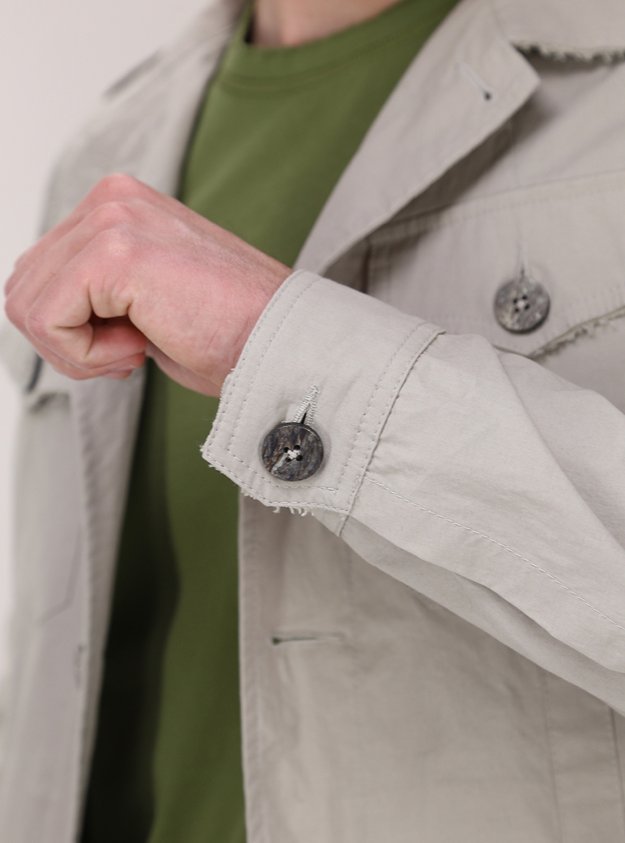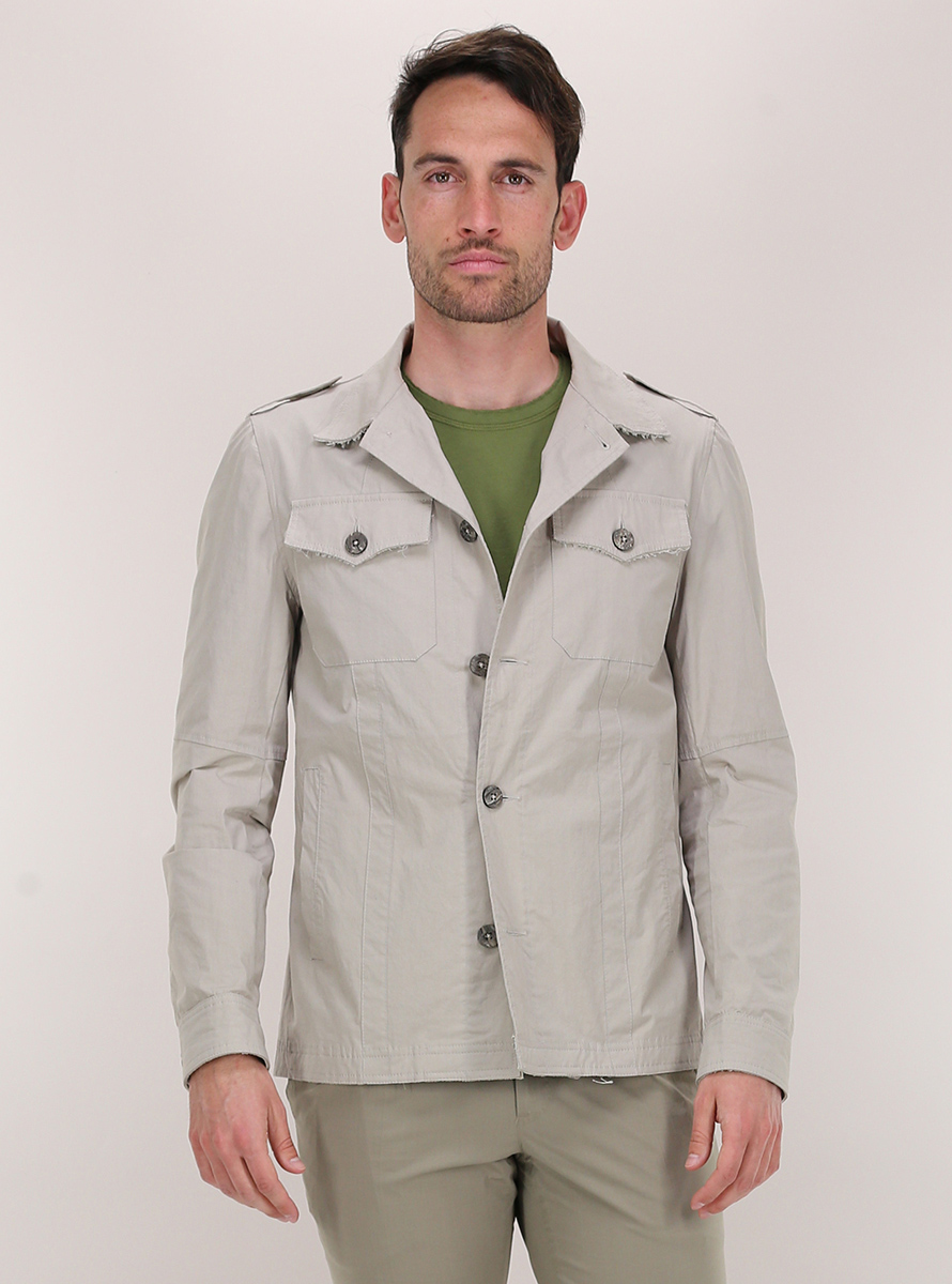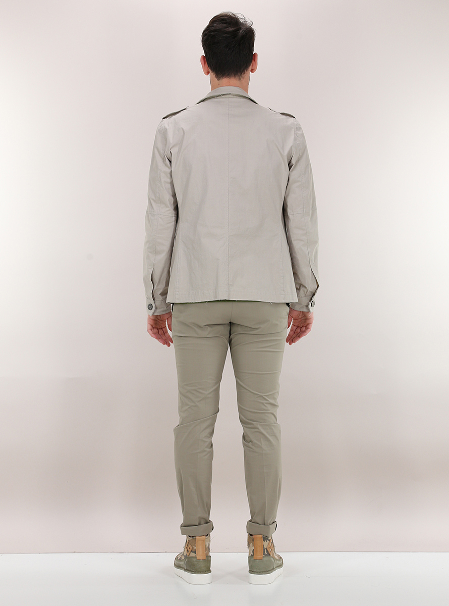 Messaggerie Saharan Jacke aus elastischer Baumwolle mit langen Ärmeln und klassischem Fransenkragen. Aufgesetzte Vorder- und Paspeltaschen. Schulterklappen mit Druckknopf. Das Model ist 1,80 groß und trägt Größe 48.