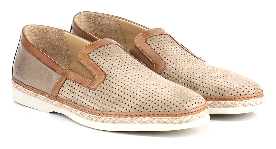 Mocassino in pelle e camoscio forato con inserto elasticizzato su ambo i lati e suola in gomma light. Tacco 25.