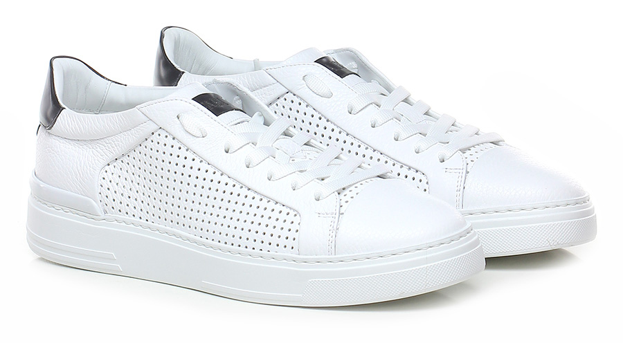 Sneaker in pelle e pelle taglio laser, suola in gomma extra light. Altezza suola: 45, platform 30 con battuta 15.