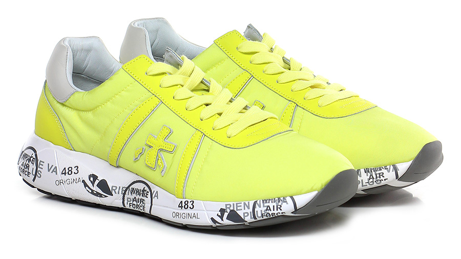 Sneaker in pelle e tessuto con suola in gomma. Tacco 50, platform 25 con battuta 25.