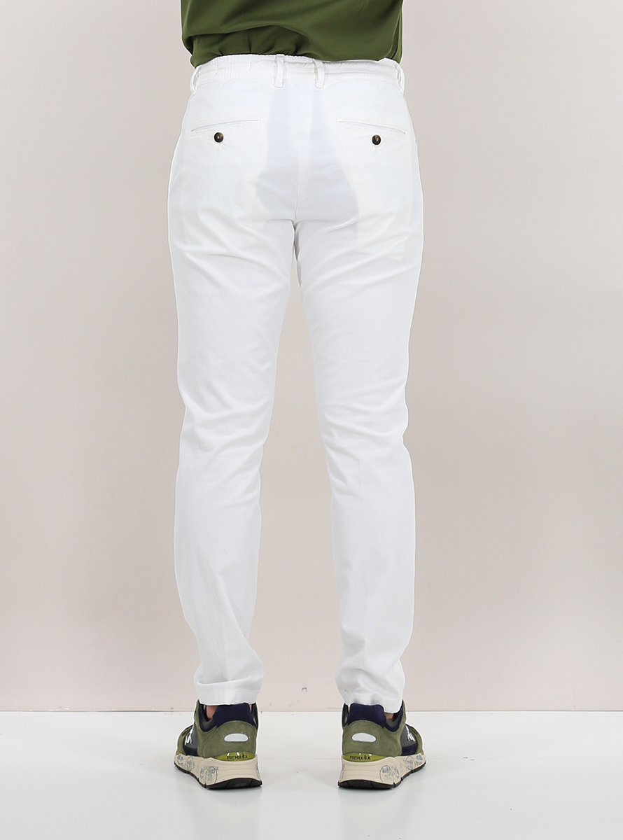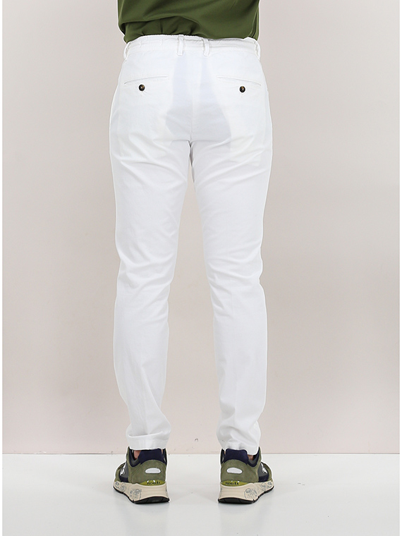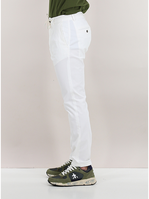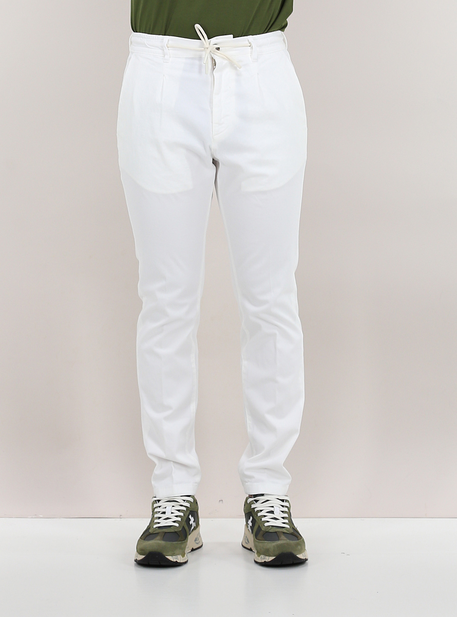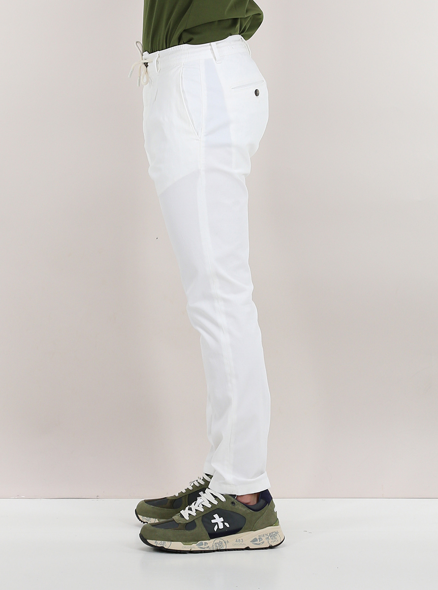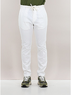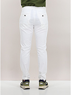 Cruna-Baumwollhose mit Kordelzug und elastischem Bund. Falten vorne. Seitliche Amerika-Taschen und Paspeltaschen auf der Rückseite. Das Model ist 1,80 groß und trägt Größe 46.