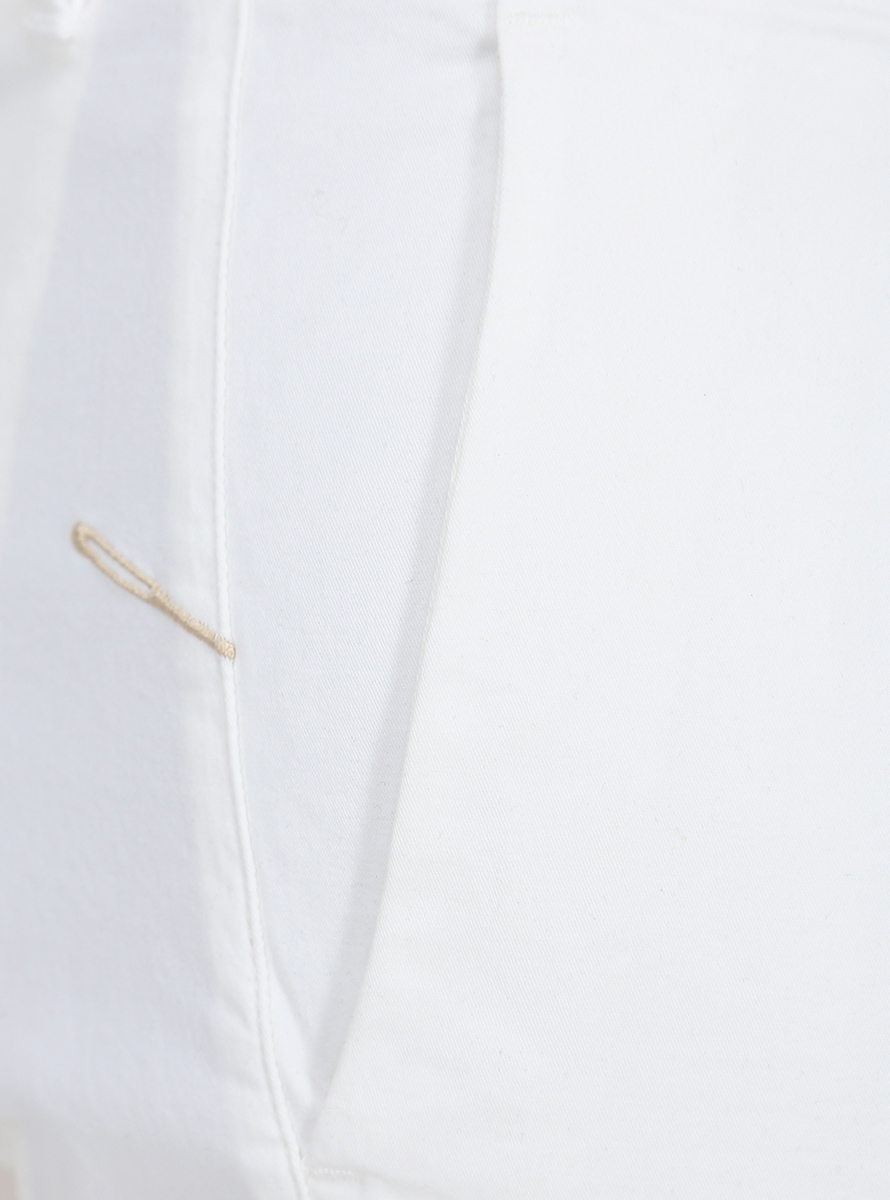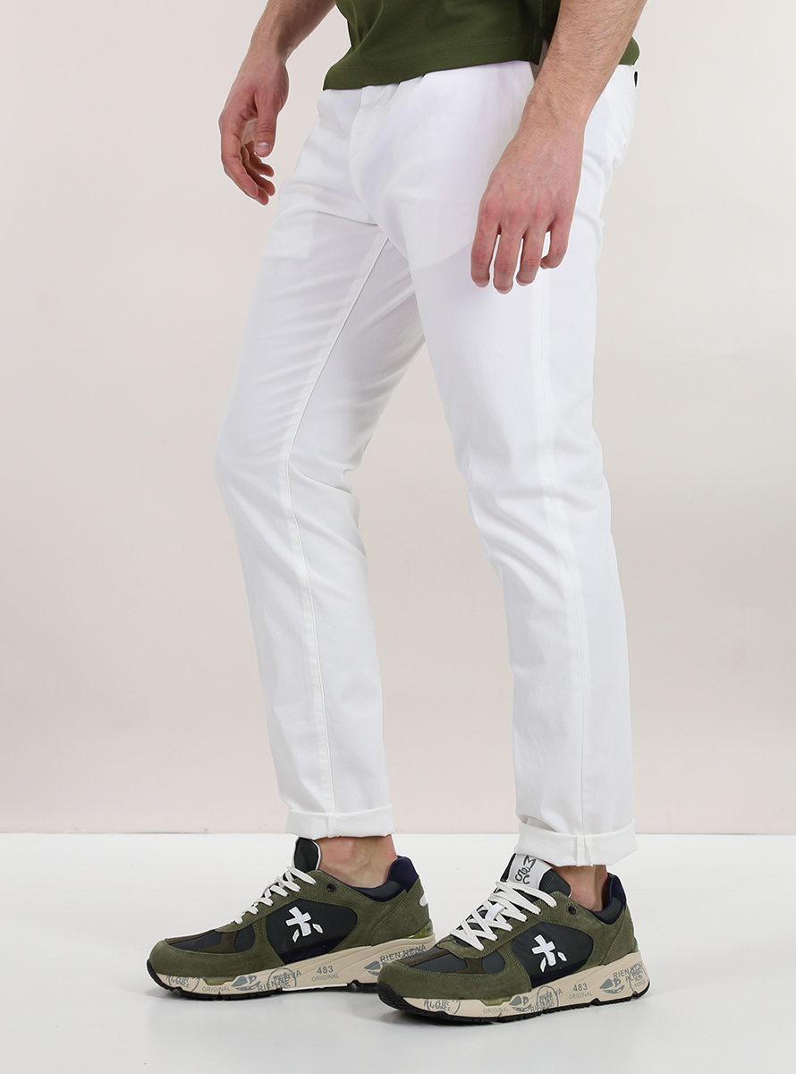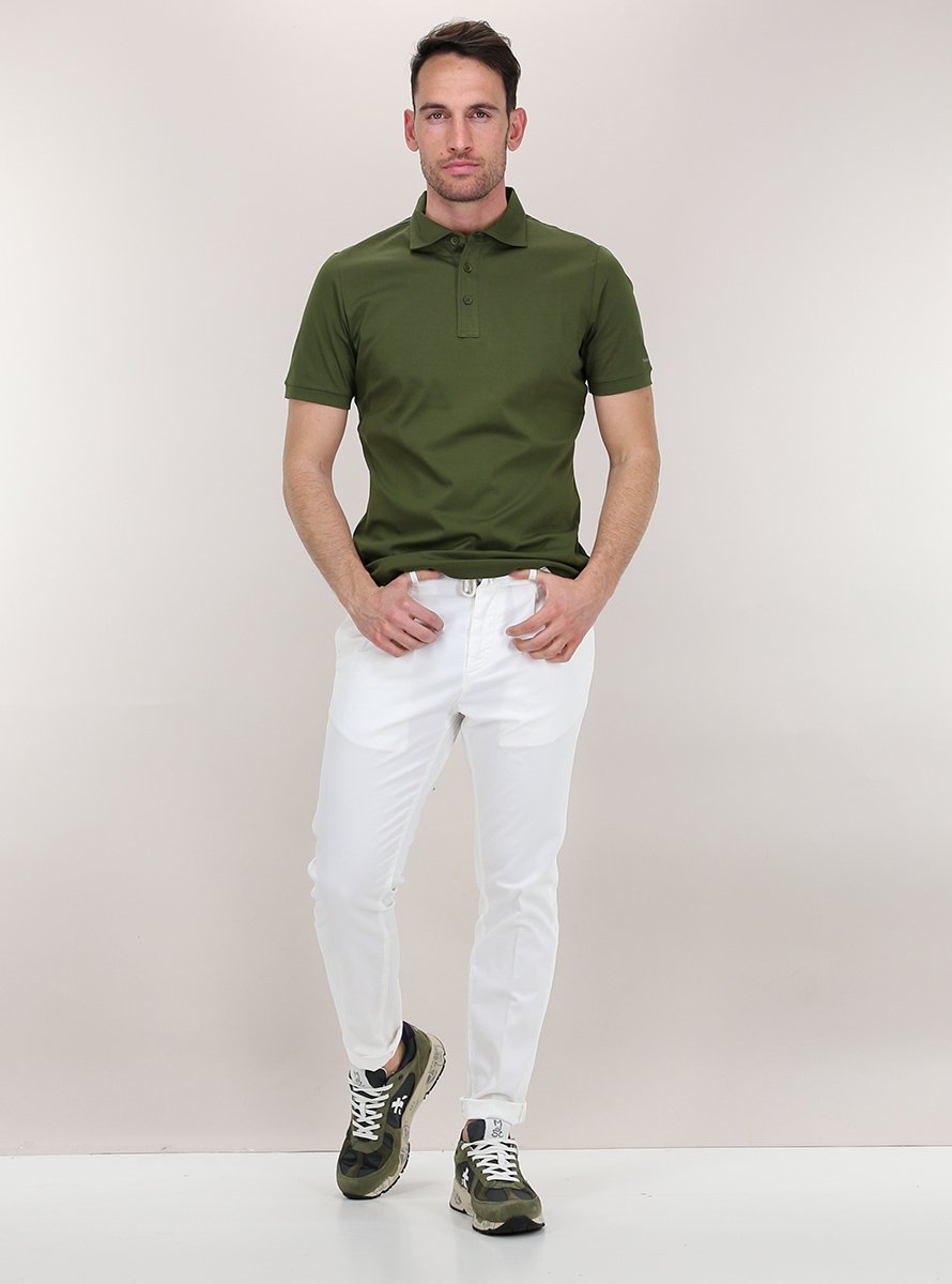 Cruna-Baumwollhose mit Kordelzug und elastischem Bund. Falten vorne. Seitliche Amerika-Taschen und Paspeltaschen auf der Rückseite. Das Model ist 1,80 groß und trägt Größe 46.