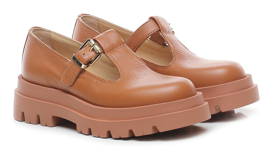 Niedriger, klobiger Schuh aus strukturiertem Leder im Mary-Jane-Stil, Gummisohle. 55 Absatz, 35 Plateau mit 20 bar.