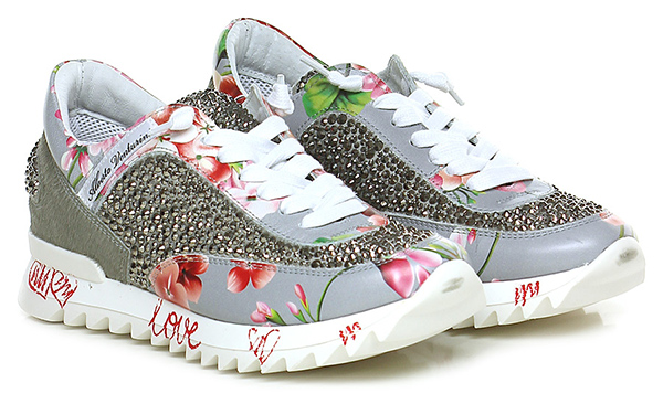 Sneaker in pelle e cavallino con strass su tomaia e suola in gomma. Tacco 45, platform 25 con battuta 20.