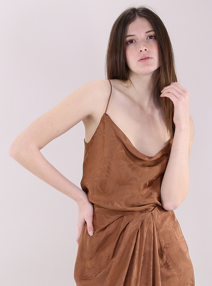 Top Simona Corsellini in viscosa. Fantasia jungle tono su tono. La modella è alta 1,74 e indossa la taglia 40.