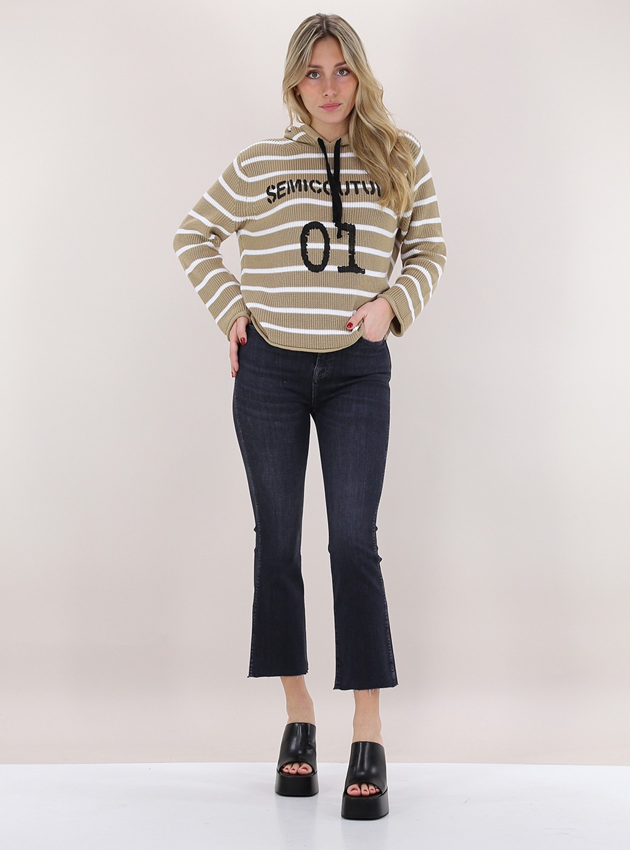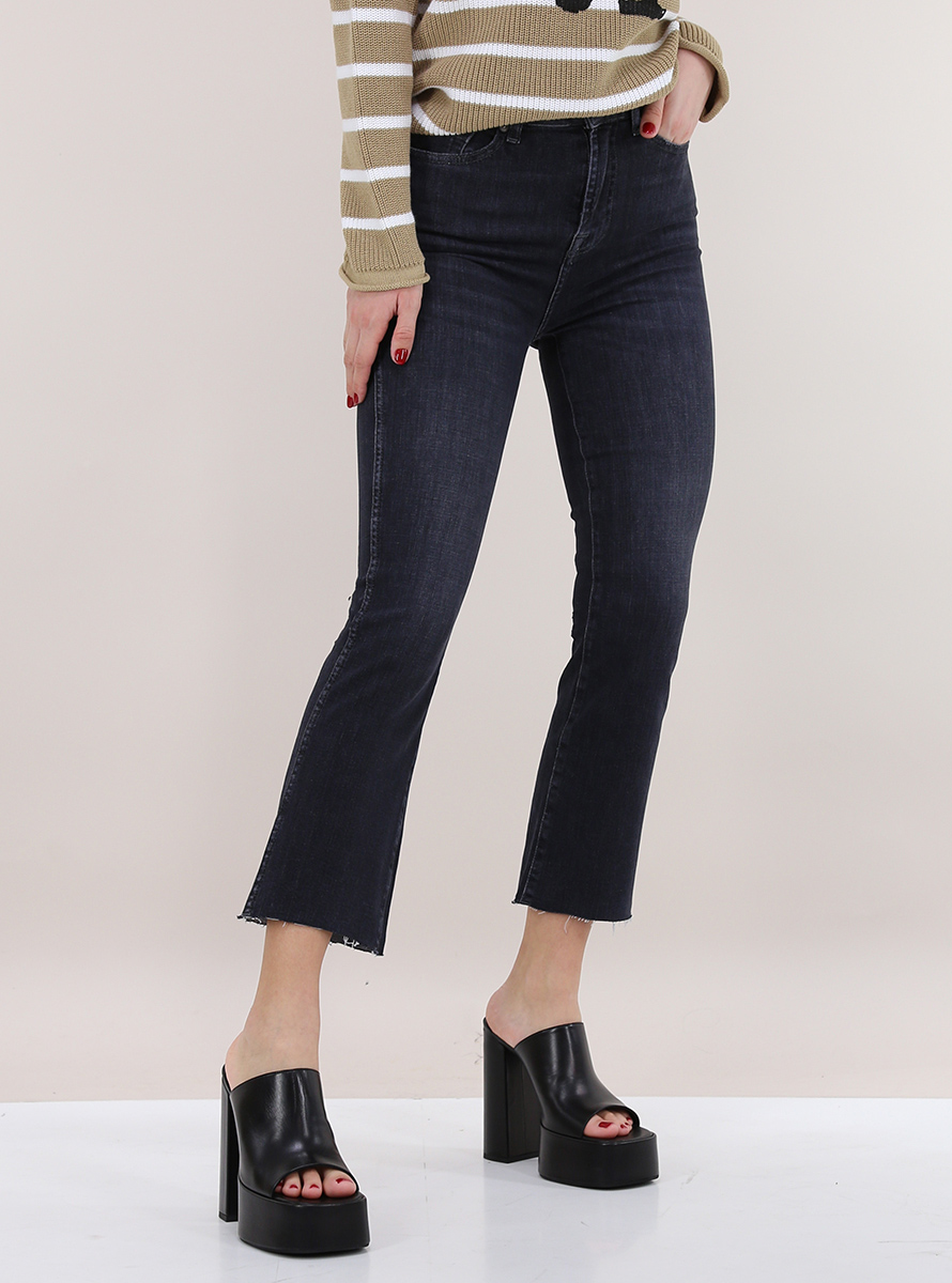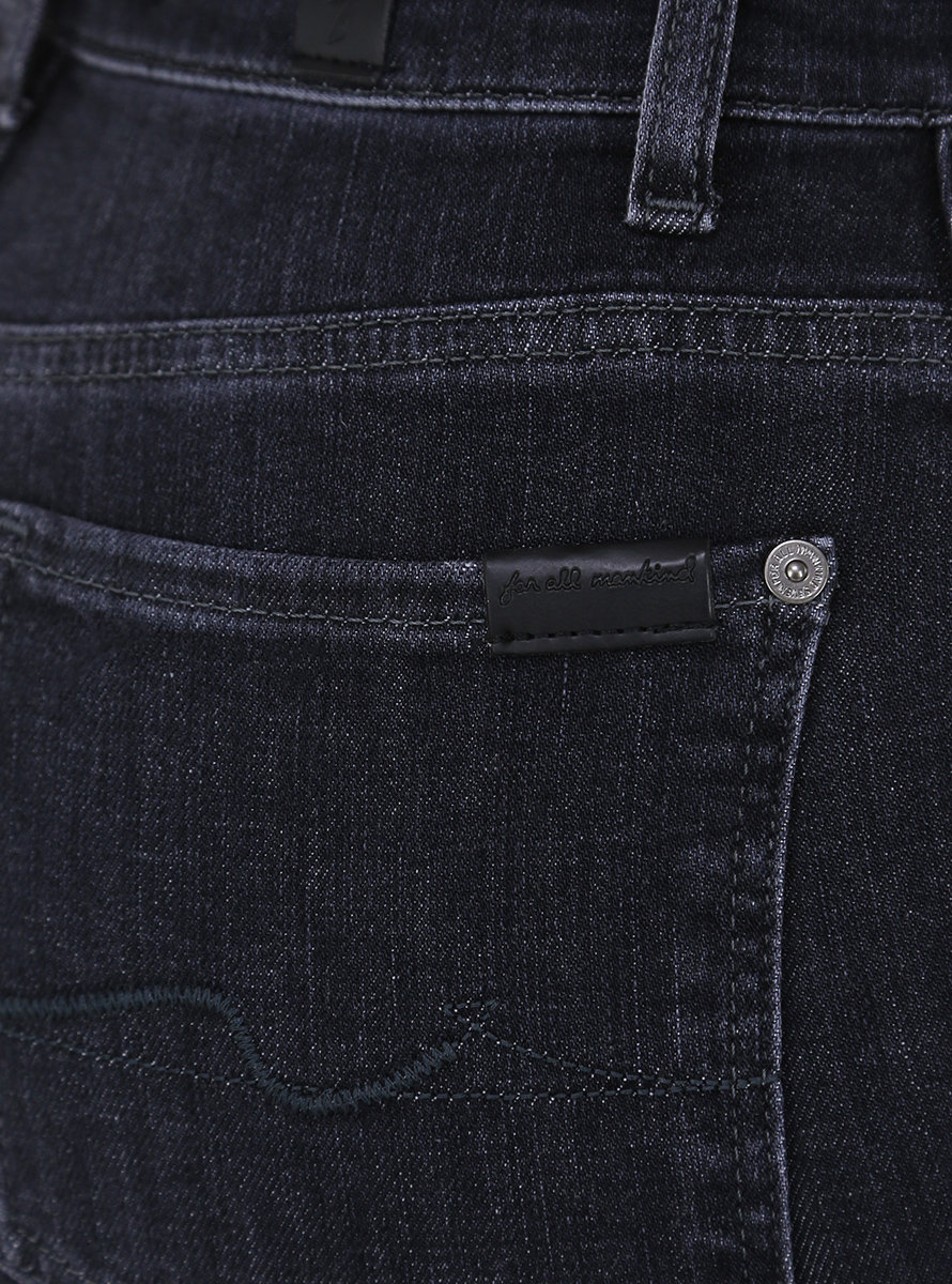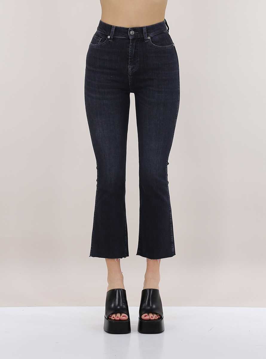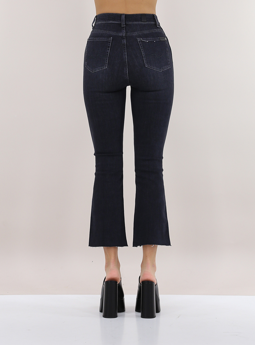 7 For All Mankind Jeans aus Stretch-Baumwolldenim. Hohe Taille, schmale Passform und ungesäumter Trompetenboden. Das Model ist 1,75 groß und trägt Größe 24.