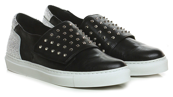 Sneaker in pelle e pelle laminata con pattella con strap e borchie su patella. Suola in gomma, tacco 30.