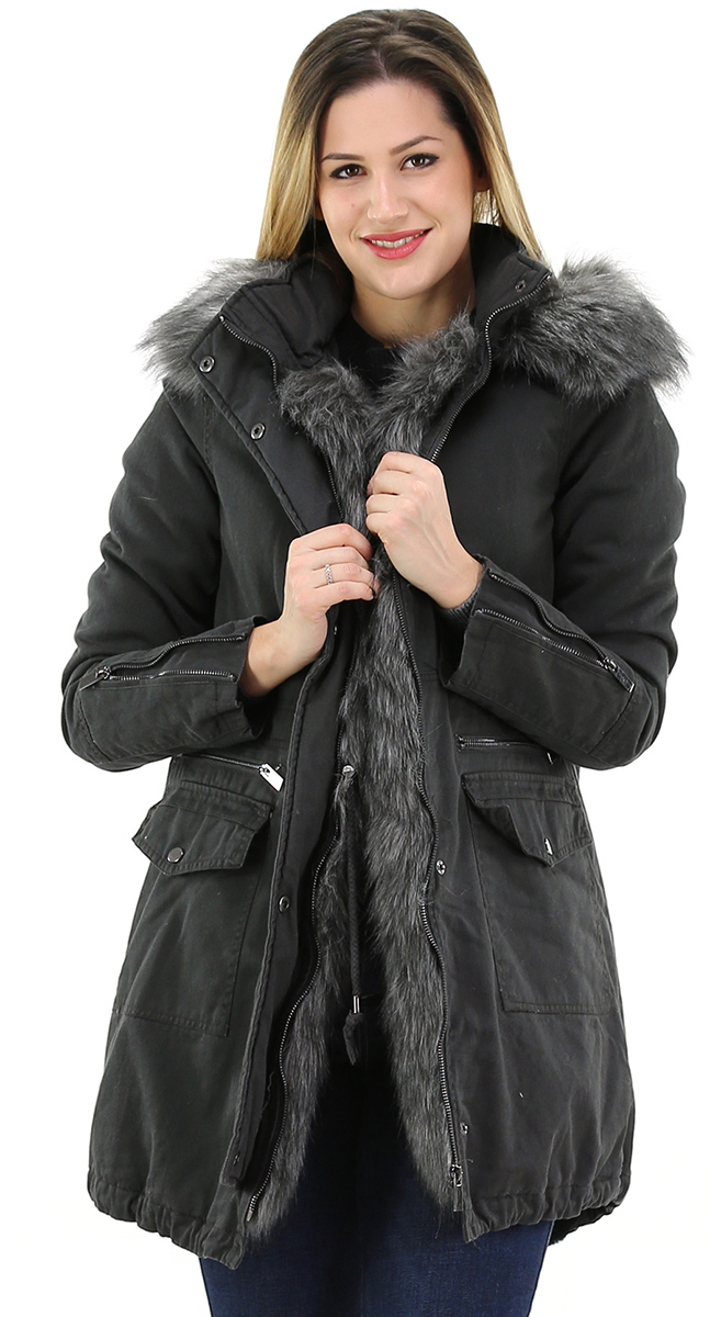 Parka in cotone con imbottitura in fake fur e maniche lunghe con zip sul fondo. Cappuccio estraibile e zip di chiusura frontale. La modella è alta 1.75 ed indossa la taglia XS.