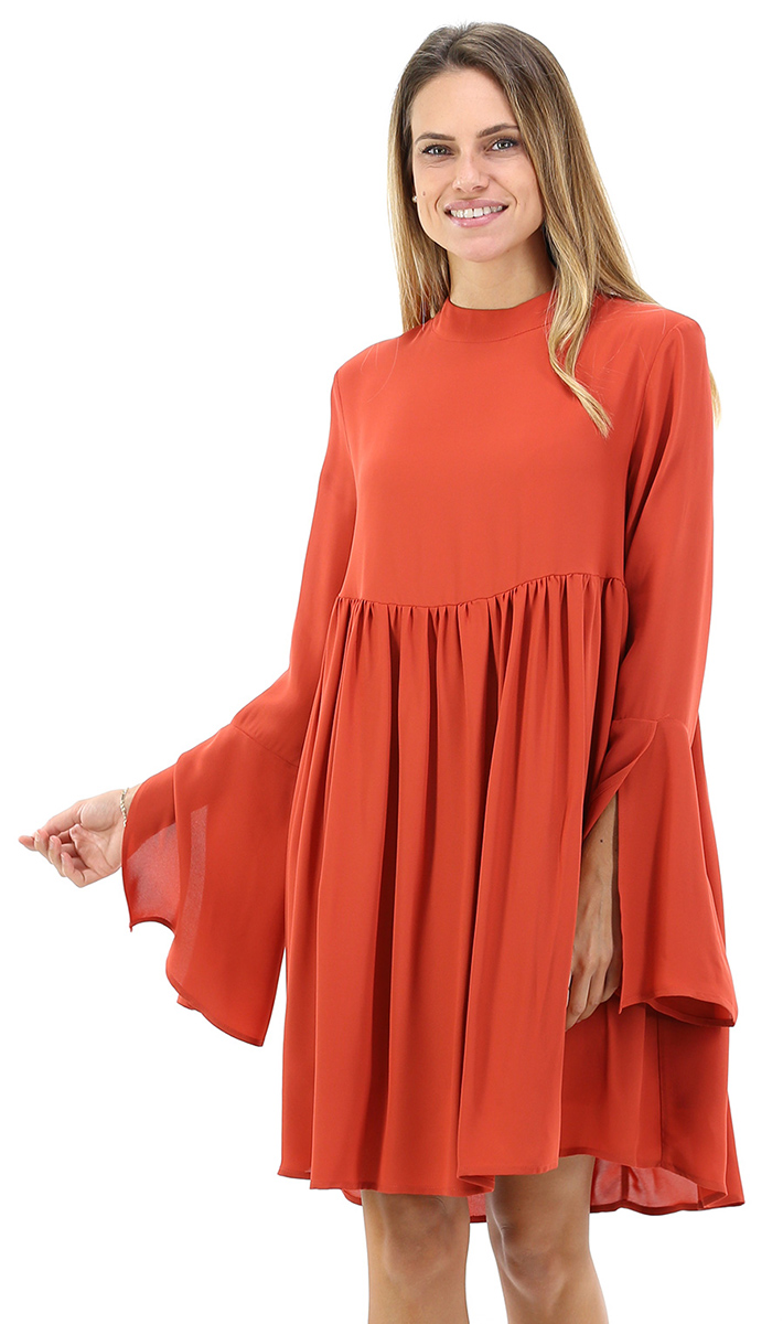 Abito ampio in viscosa, foderato e arricciato in vita, maniche lunghe con spacco sul fondo. Scollo a giro e zip di chiusura sul retro. La modella è alta 1.68 ed indossa la taglia 40.