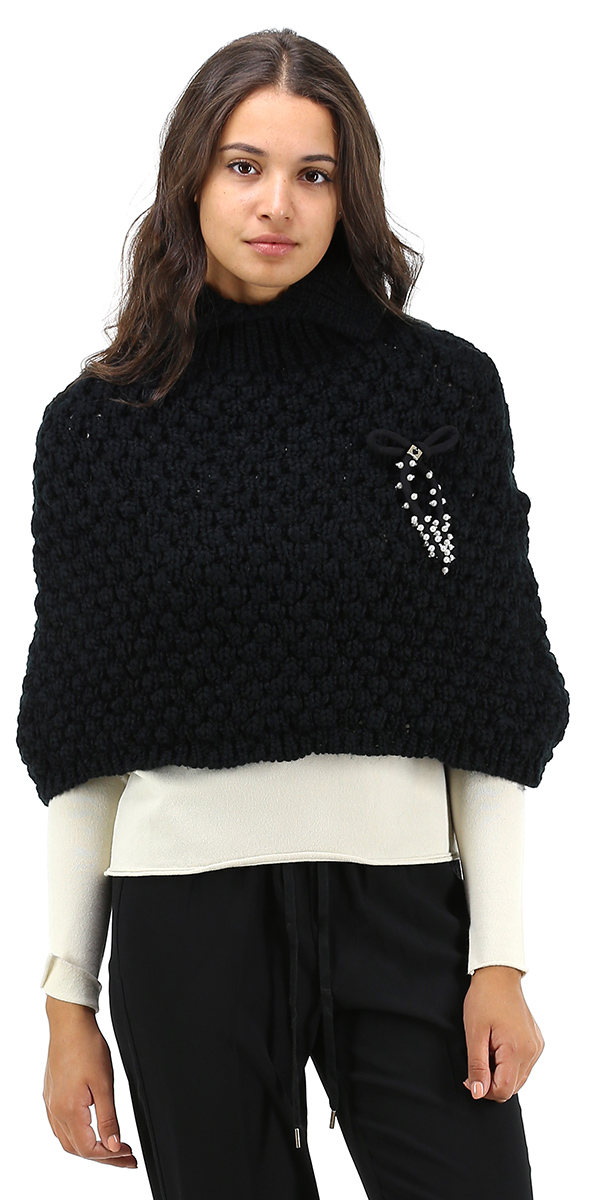 Cappa a collo alto con dettaglio di fiocco con perle.