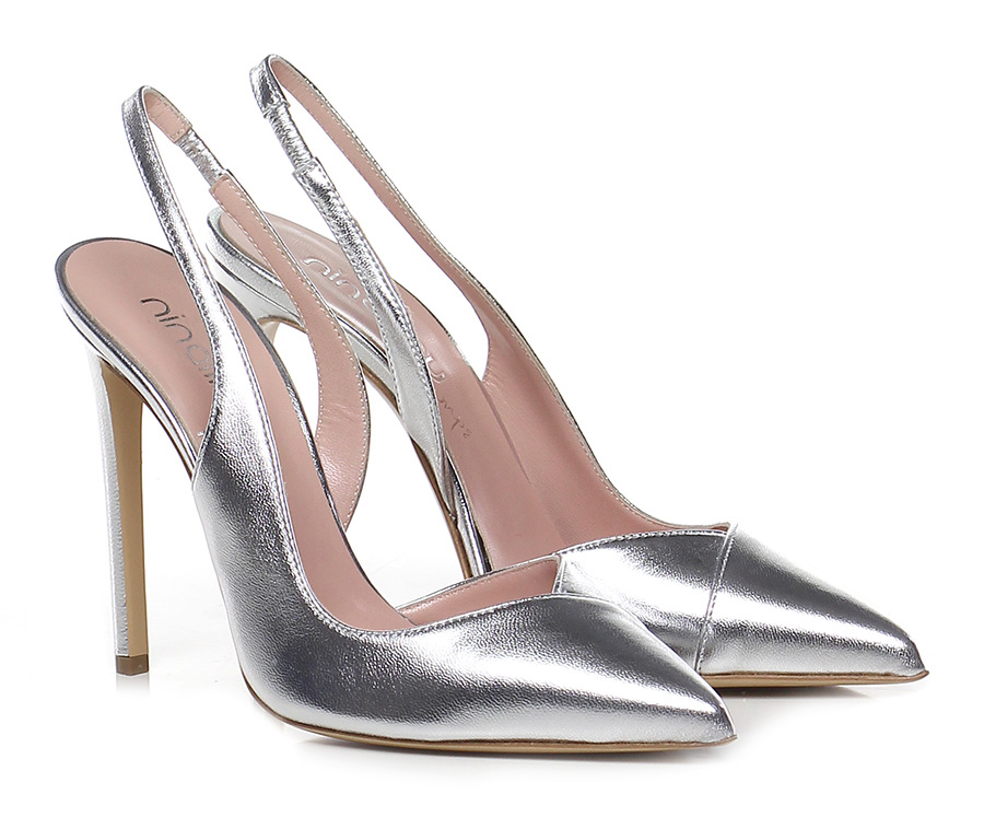 Scarpa con tacco in nappa laminata con cinturino sul retro elasticizzato, suola in cuoio. Tacco 110.