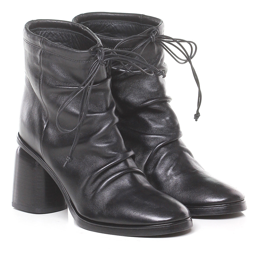 Tronchetto in pelle con allacciatura frontale e suola in cuoio e gomma. Tacco 90, platform 15 con battuta 75.