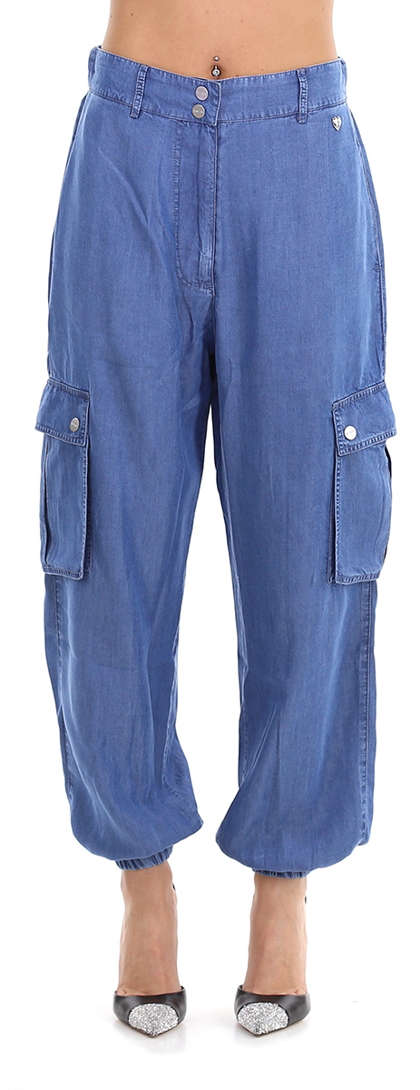 Cargo trousers in lyocel with elastic waist on the back. The model is 1.68 tall and wears size XS.