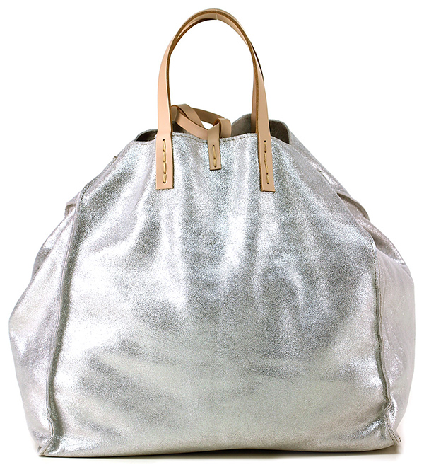 Borsa in camoscio laminato effetto con chiusura a laccio in pelle e gancio. Sacca interna in tessuto tecnico estraibile. Misure 32 x 33 cm.