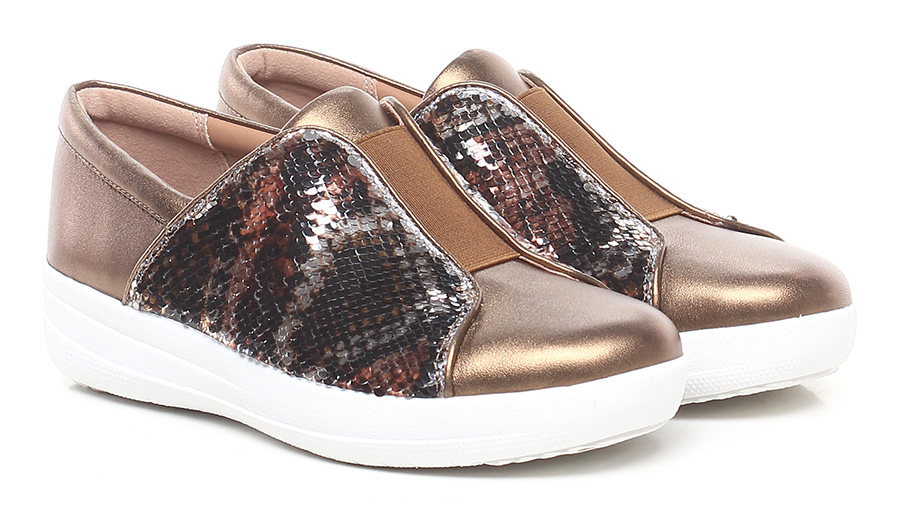 Sneaker in pelle laminata e paillettes con inserti elasticizzati frontali. Suola in gomma, tacco 45, platform 25 con battuta 20.
