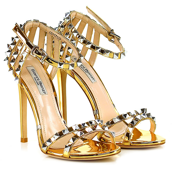 Sandalo alto in pelle laminata con cinturino alla caviglia e borchie su tomaia. Suola in cuoio, tacco 120.