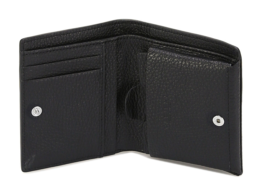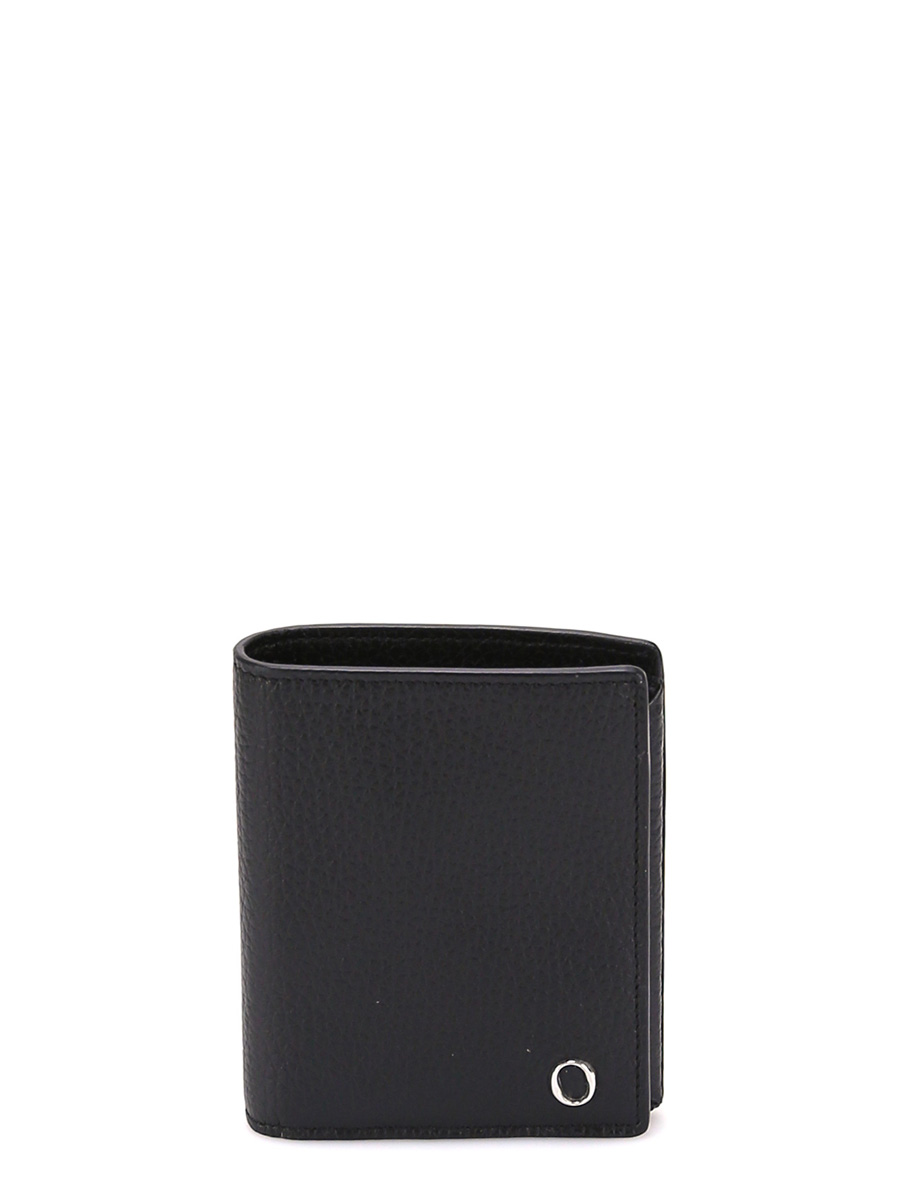 Wallet in hammered leather with closure button. Internal compartments for cards and banknotes. Measures 10 x 12cm.