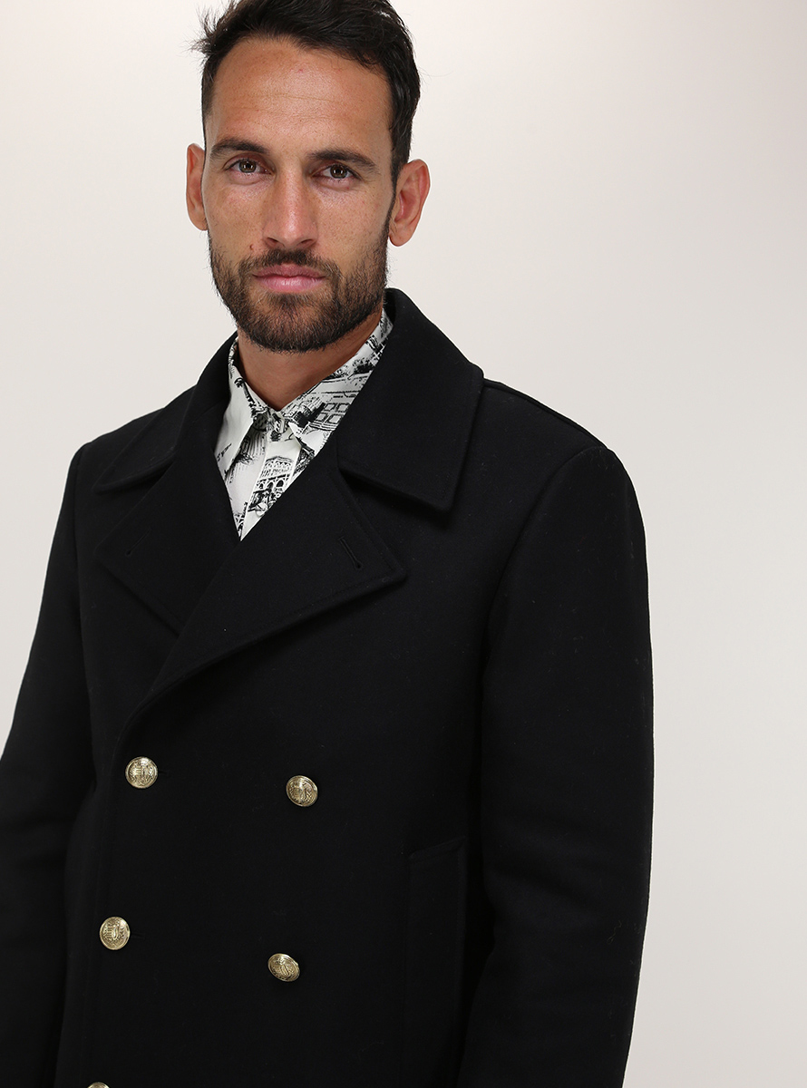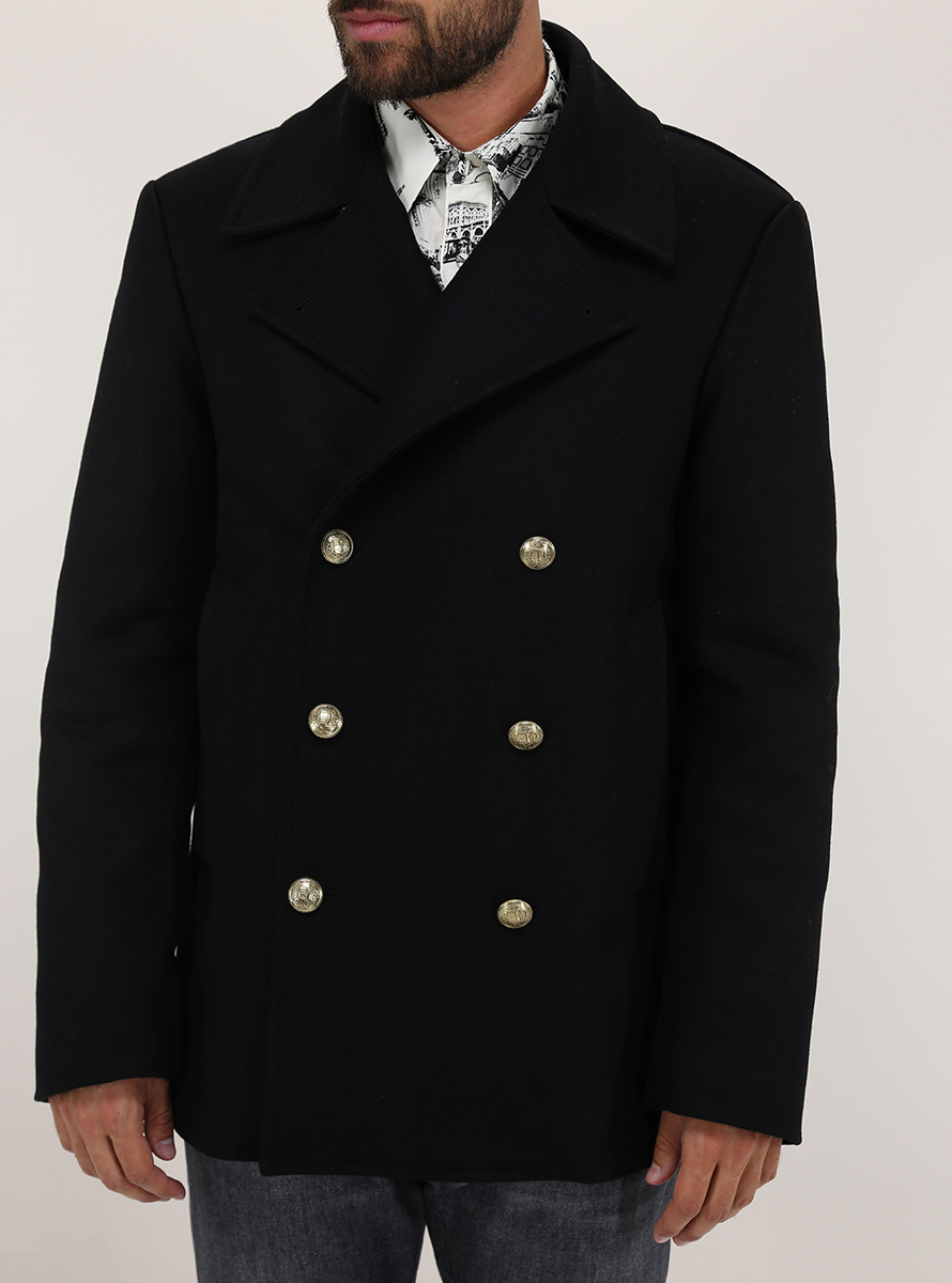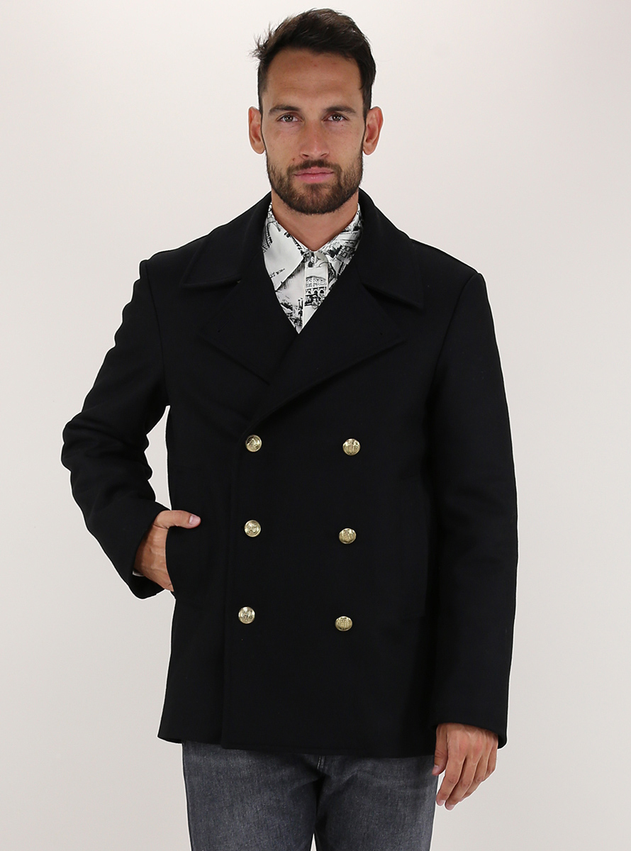 Pikot Grifoni in wool blend with internal padding. Long sleeves and front flap pockets. Double-breasted closure with gold buttons. The model is 1.80 tall and wears size 48.