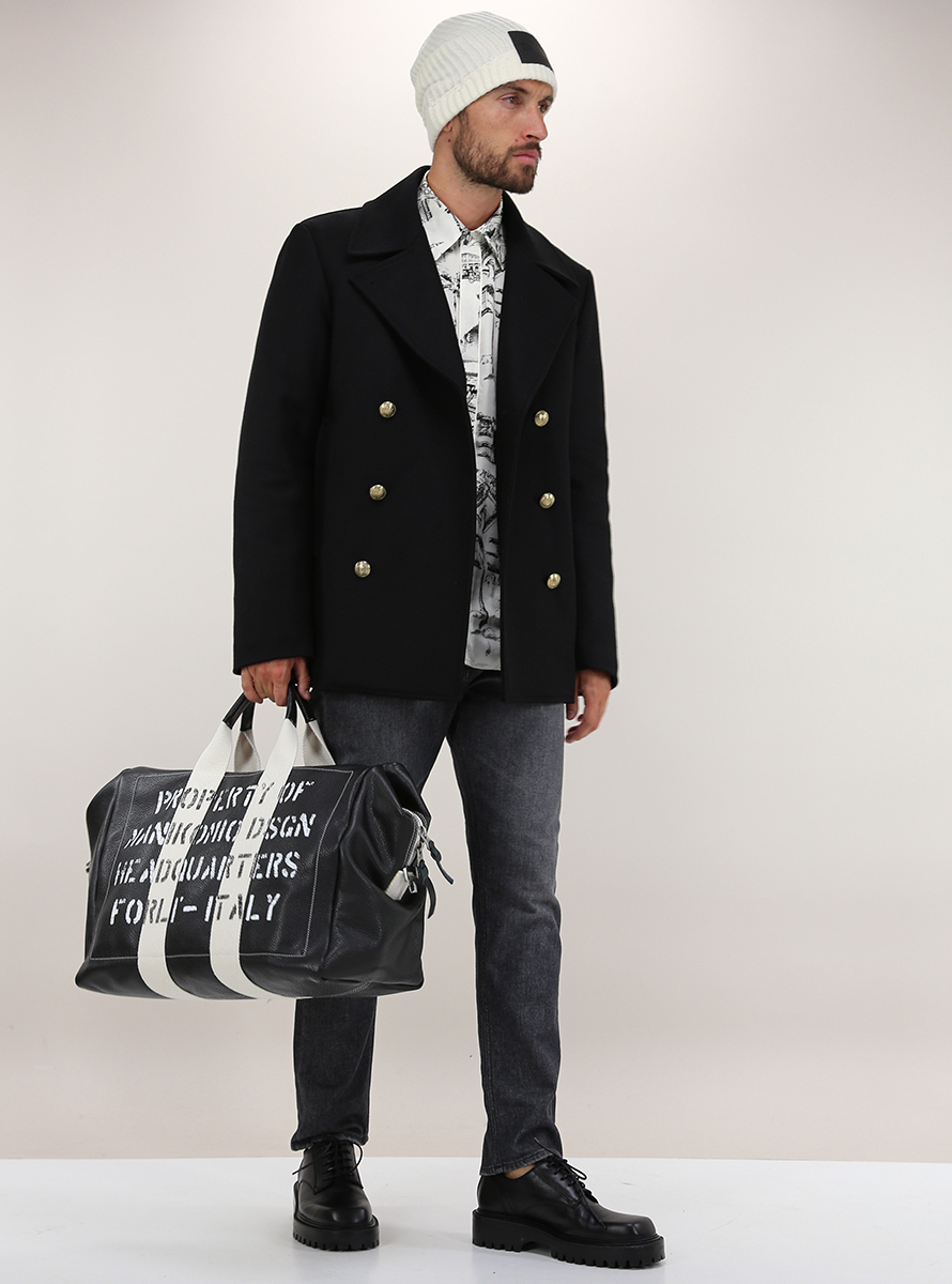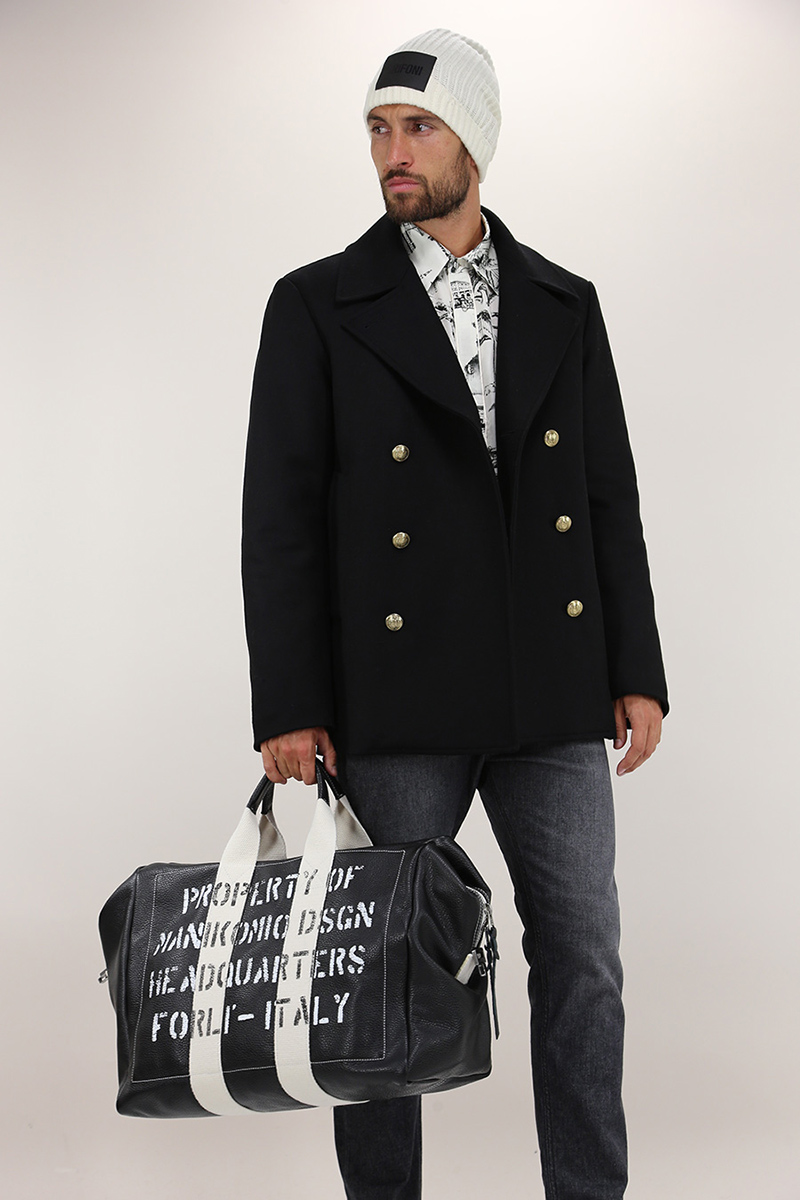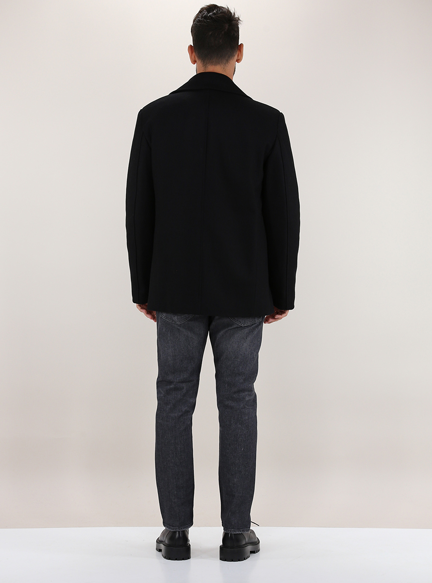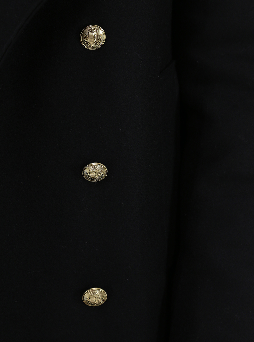 Pikot Grifoni in wool blend with internal padding. Long sleeves and front flap pockets. Double-breasted closure with gold buttons. The model is 1.80 tall and wears size 48.