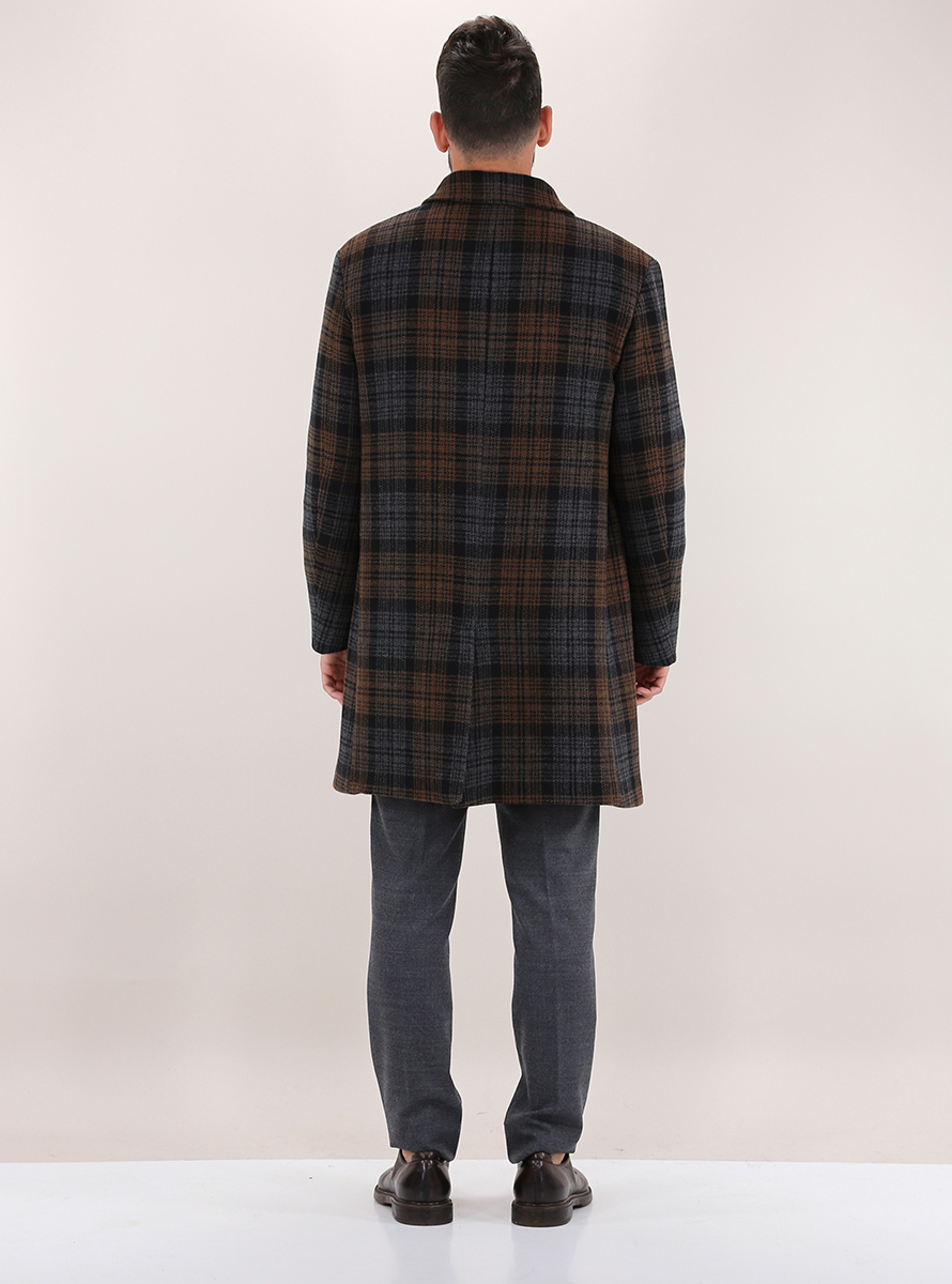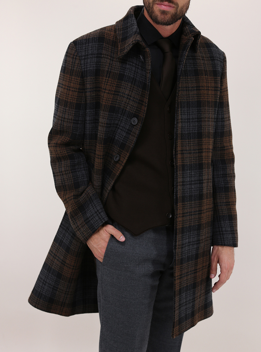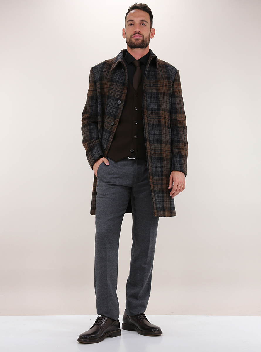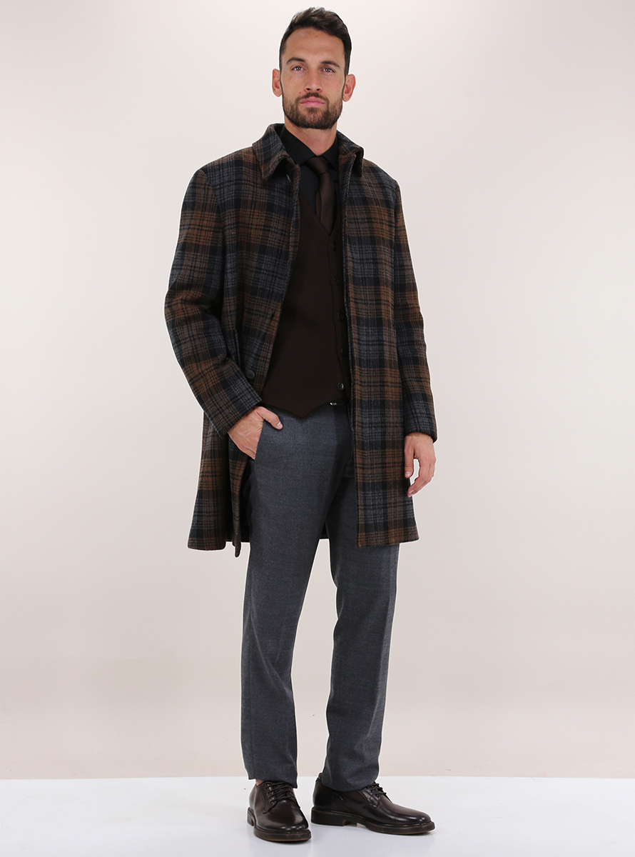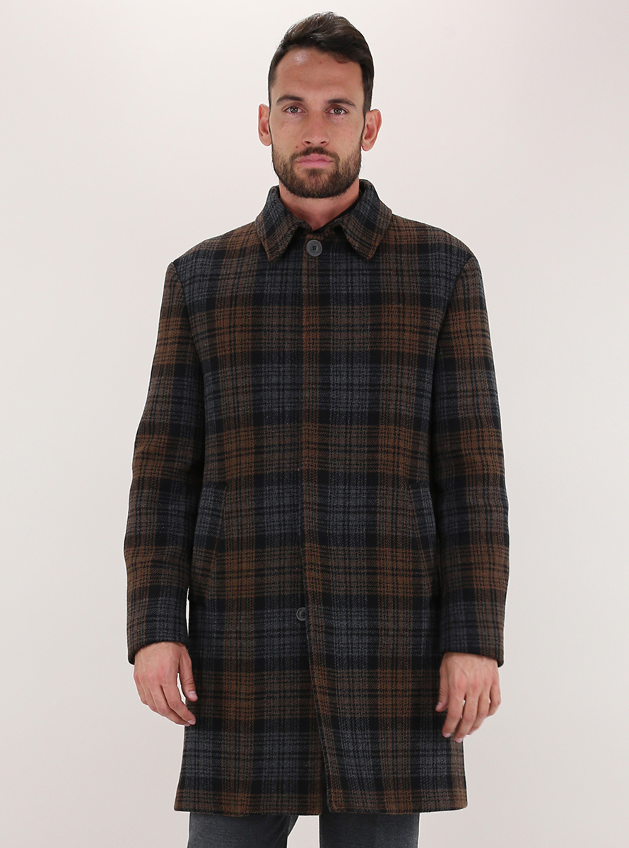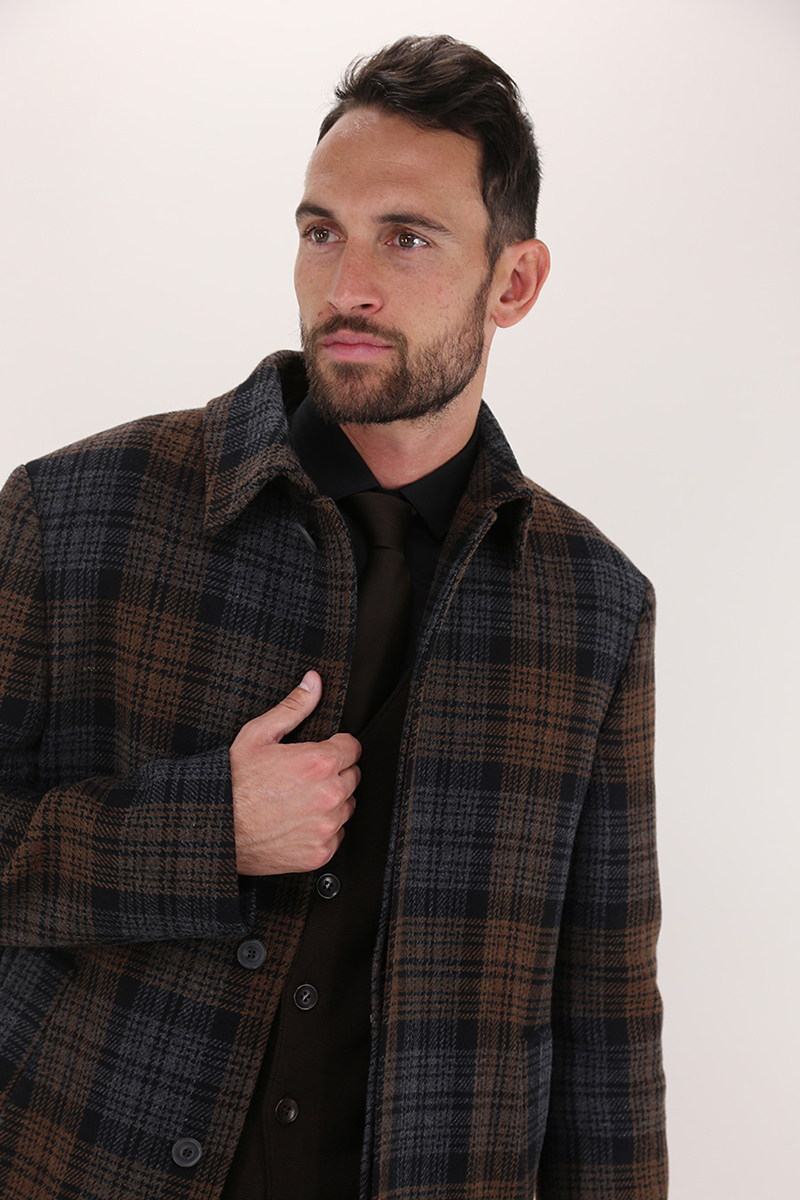 T-Jacket lined coat in wool blend with short sleeves and classic collar. Side pockets and front closure buttons. Back vent. Fantasy Check. The model is 1.80 tall and wears size M.