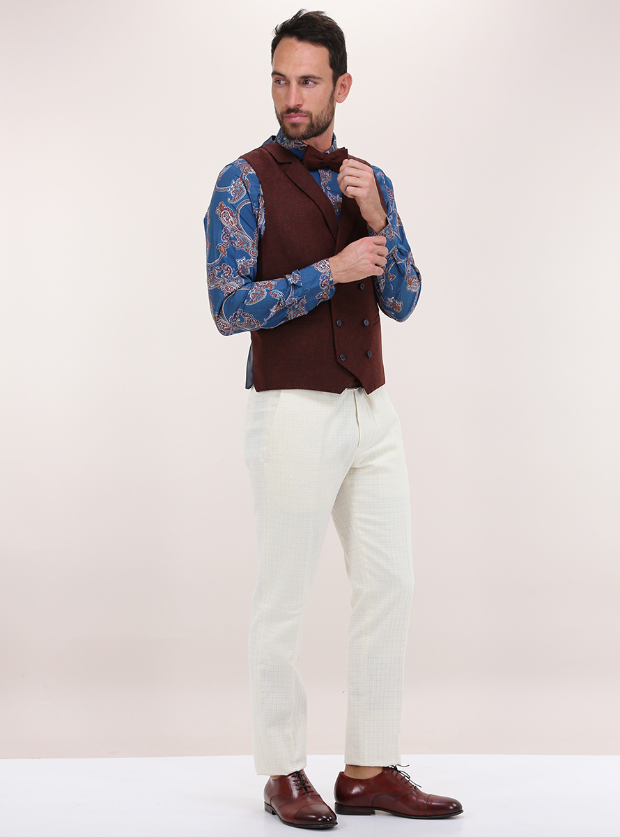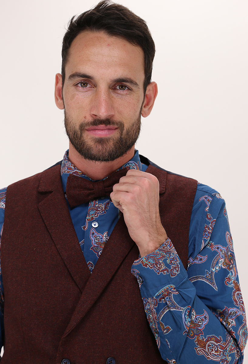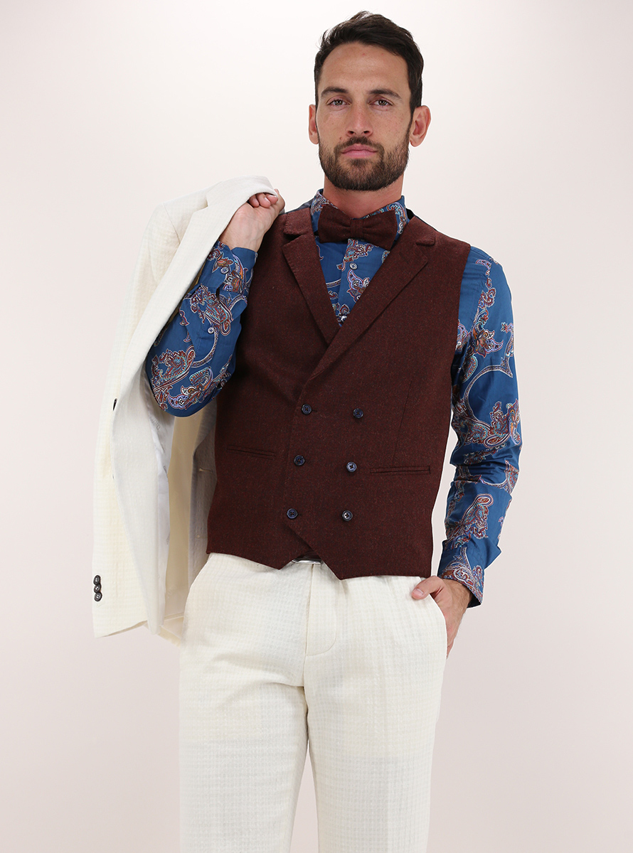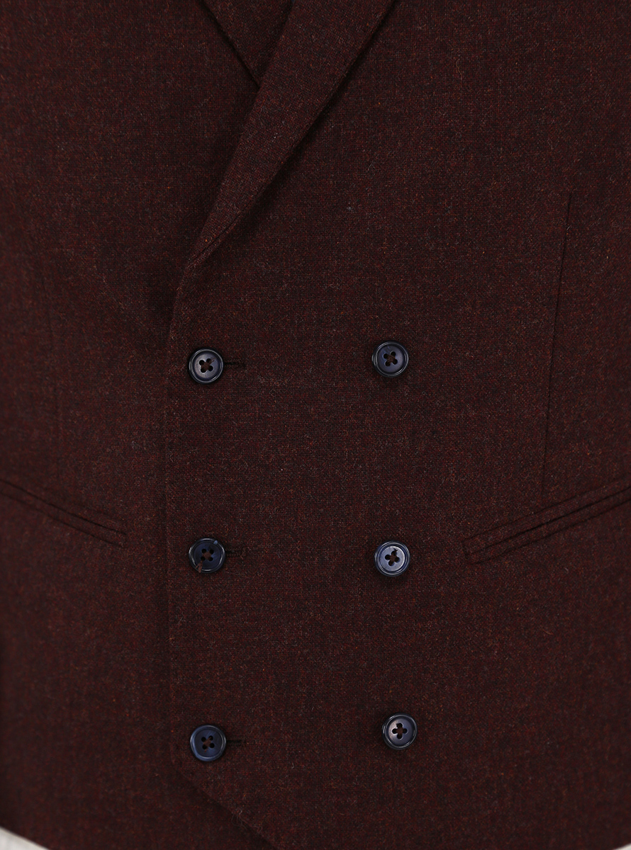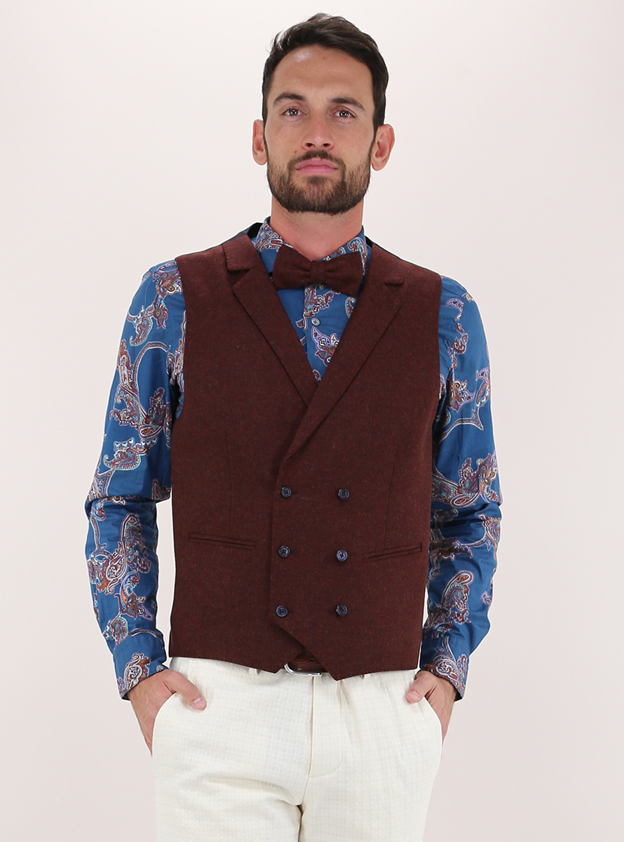 Old Crest waistcoat in wool and cashmere blend with satin back. Lapel collar and front double-breasted closure buttons. Welt pockets. The model is 1.80 tall and wears size 48.