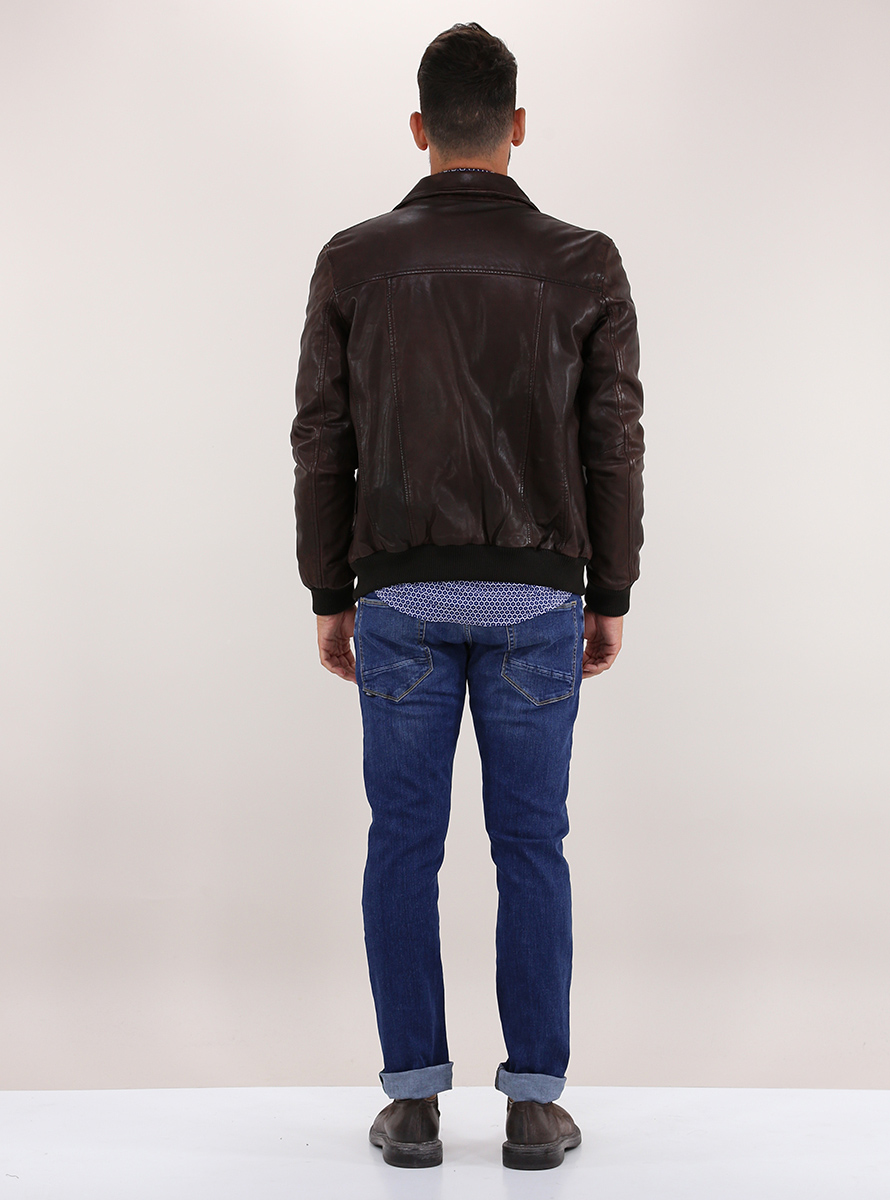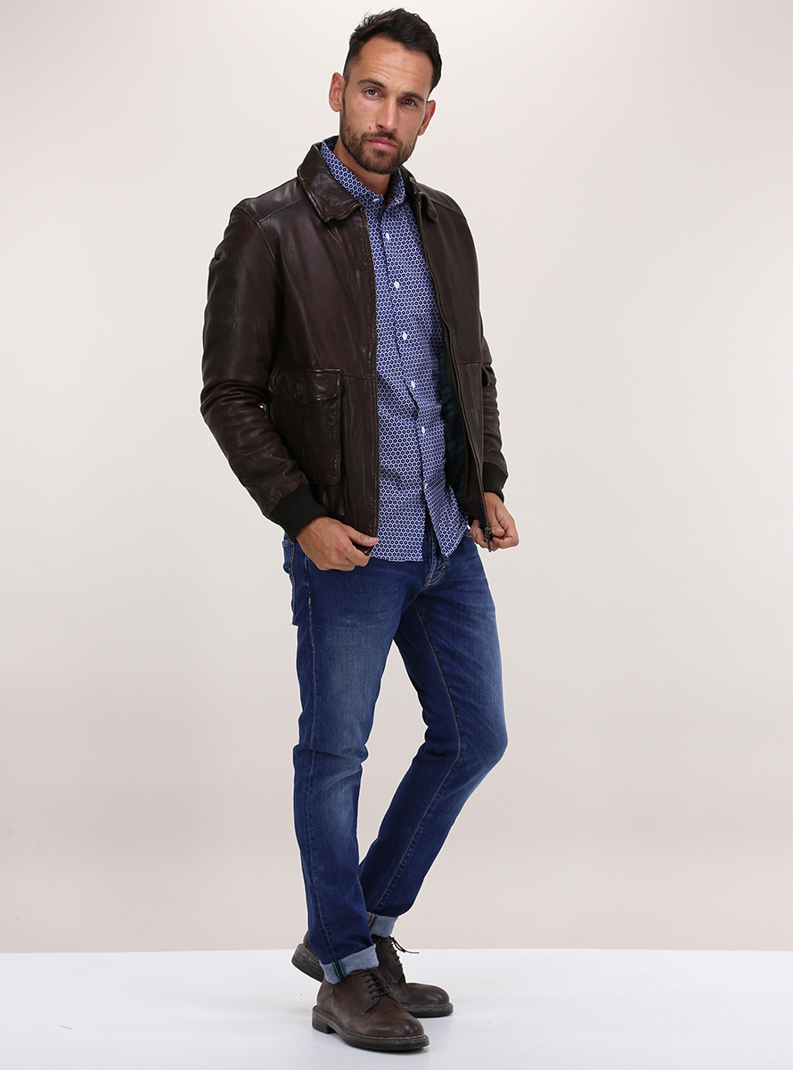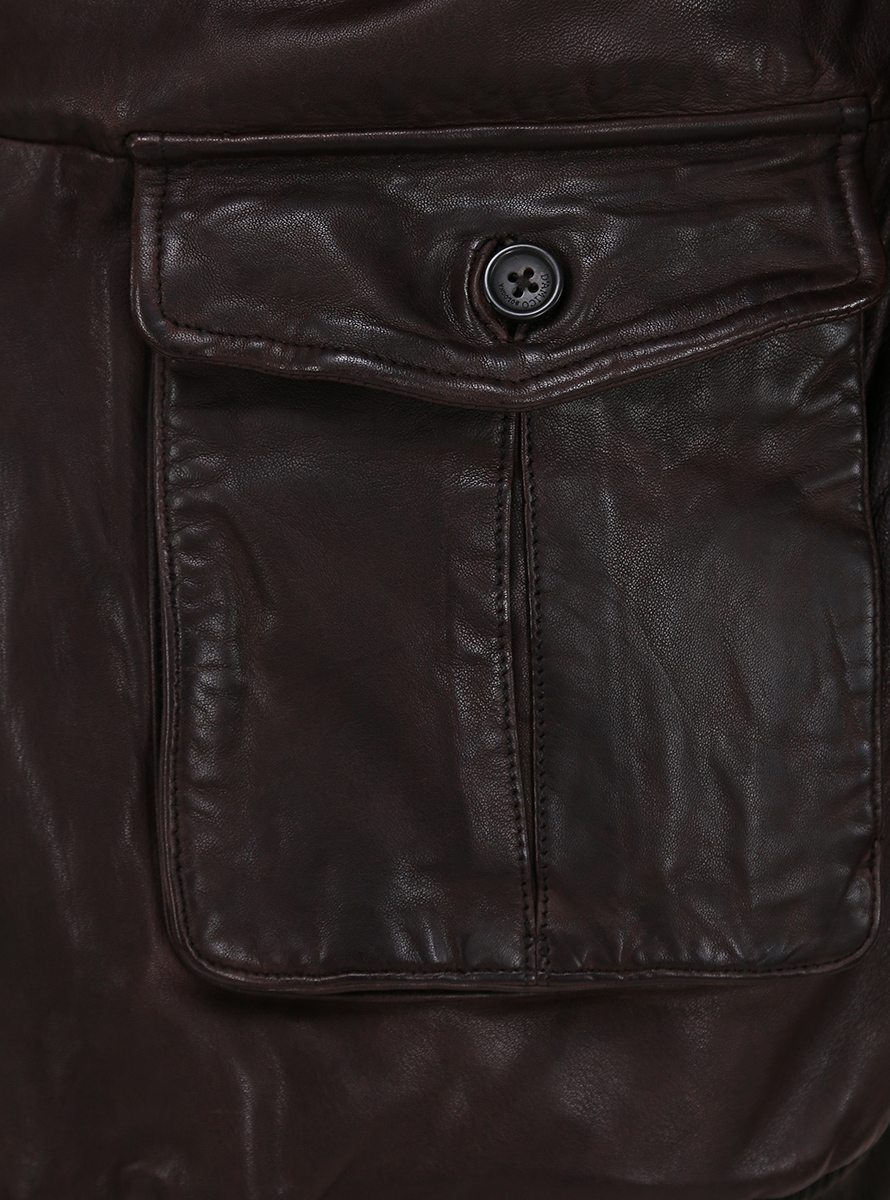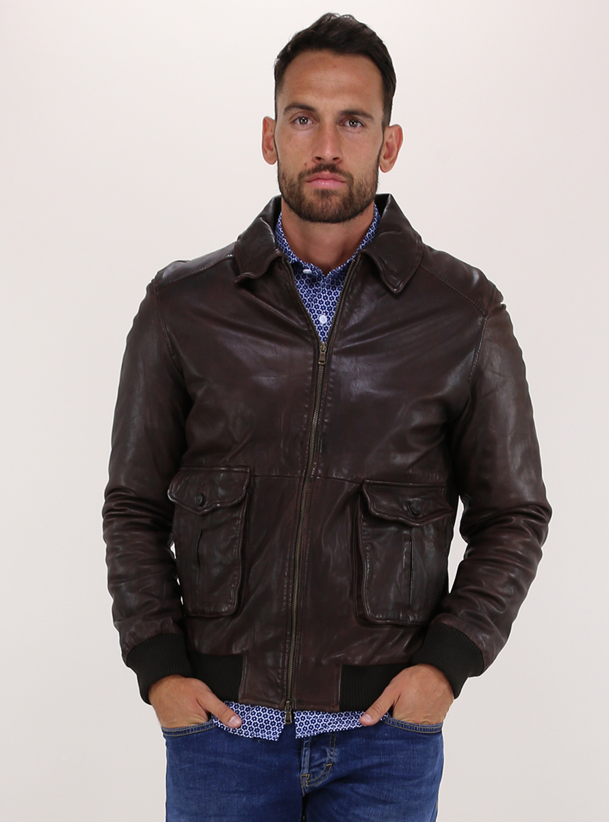 D'amico leather jacket with padded lining. Long sleeves and aviator collar. Front zip closure and patch pockets with flap. The model is 1.80 tall and wears size 48.