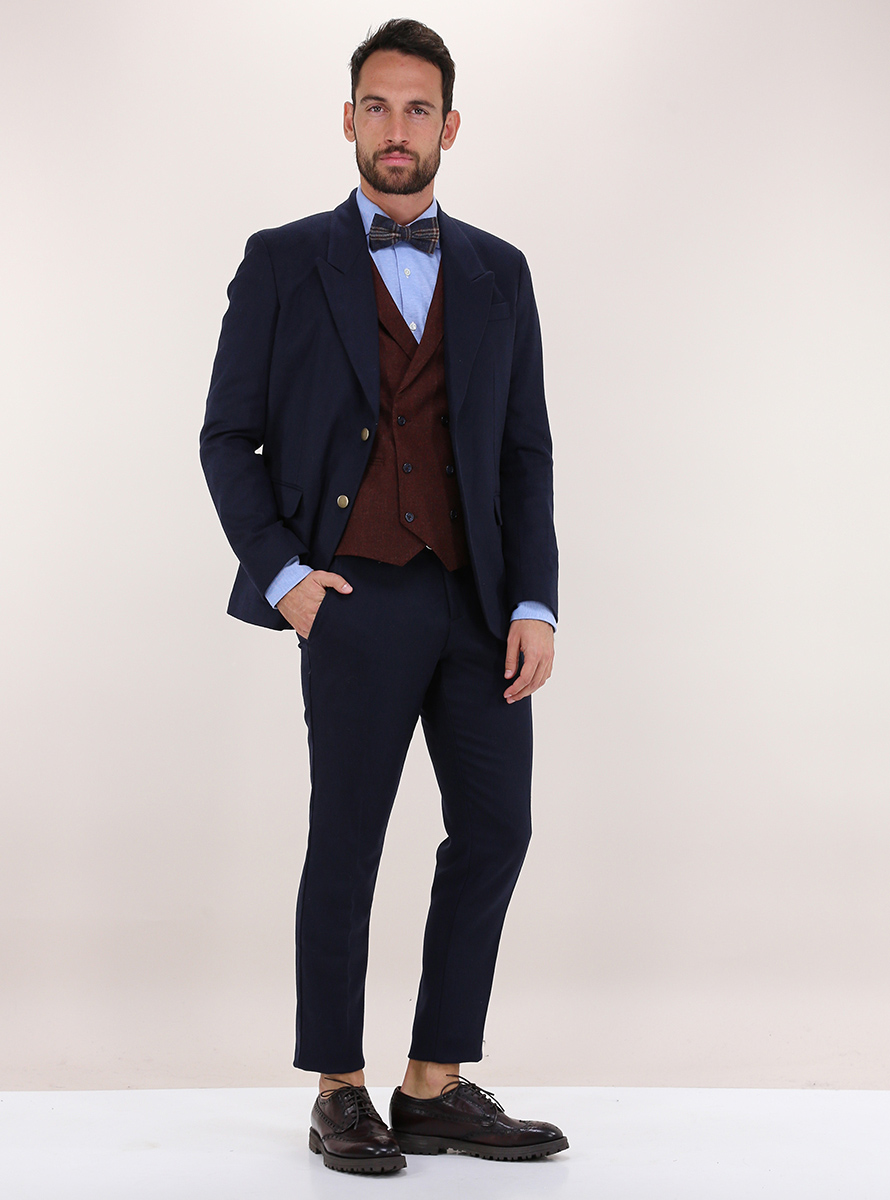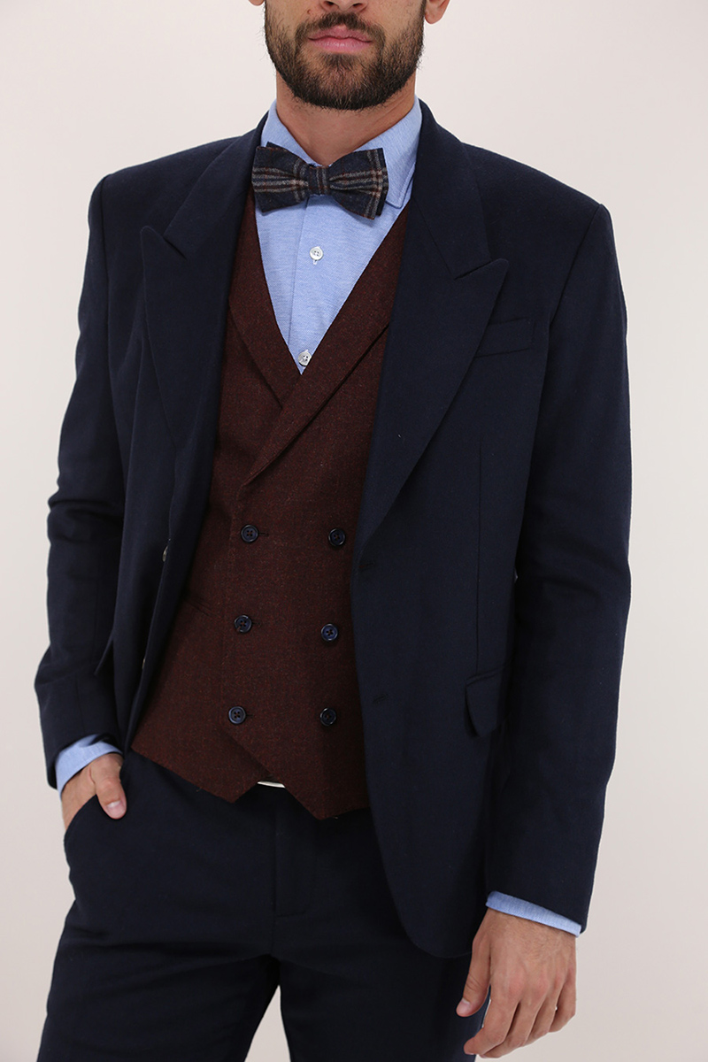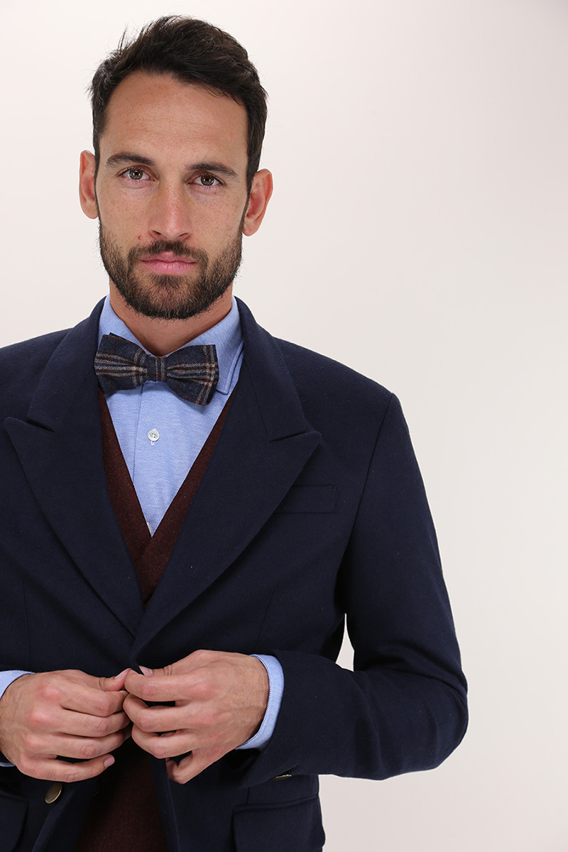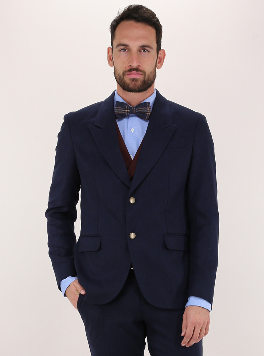 Marsem Collection jacket in semi-lined virgin wool. Long sleeves and peak lapel collar. Pockets with flaps and closure buttons on the front and on the sleeves. Double vent on the back. The model is 1.80 tall and wears size 48.