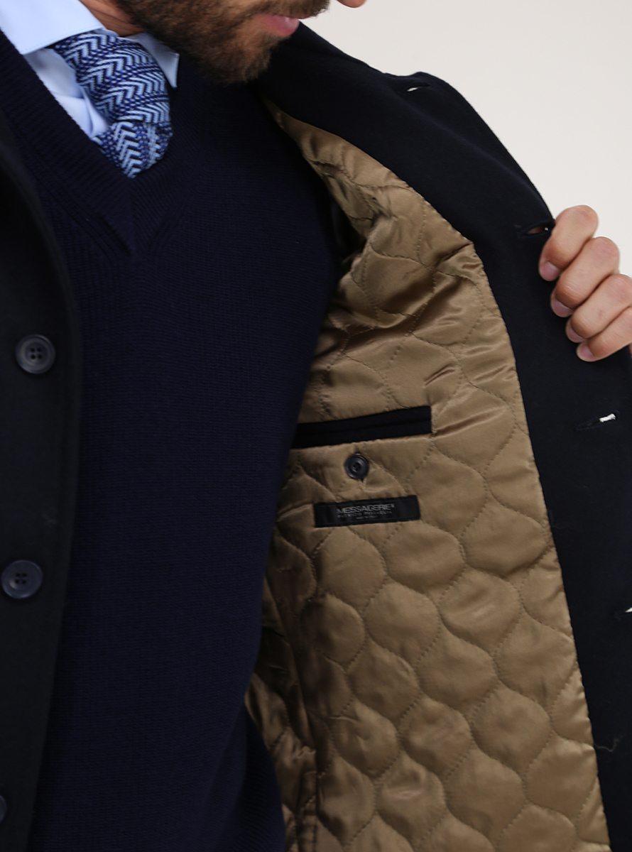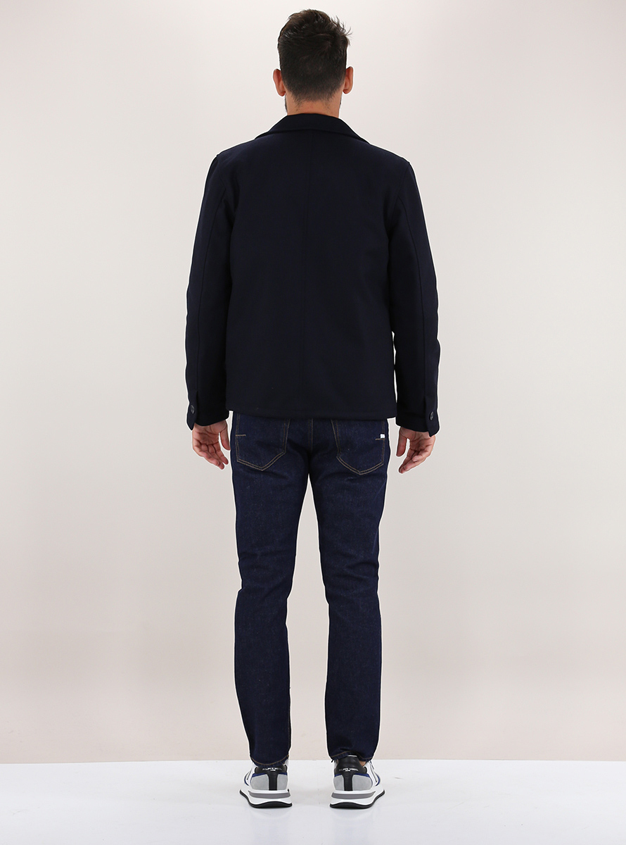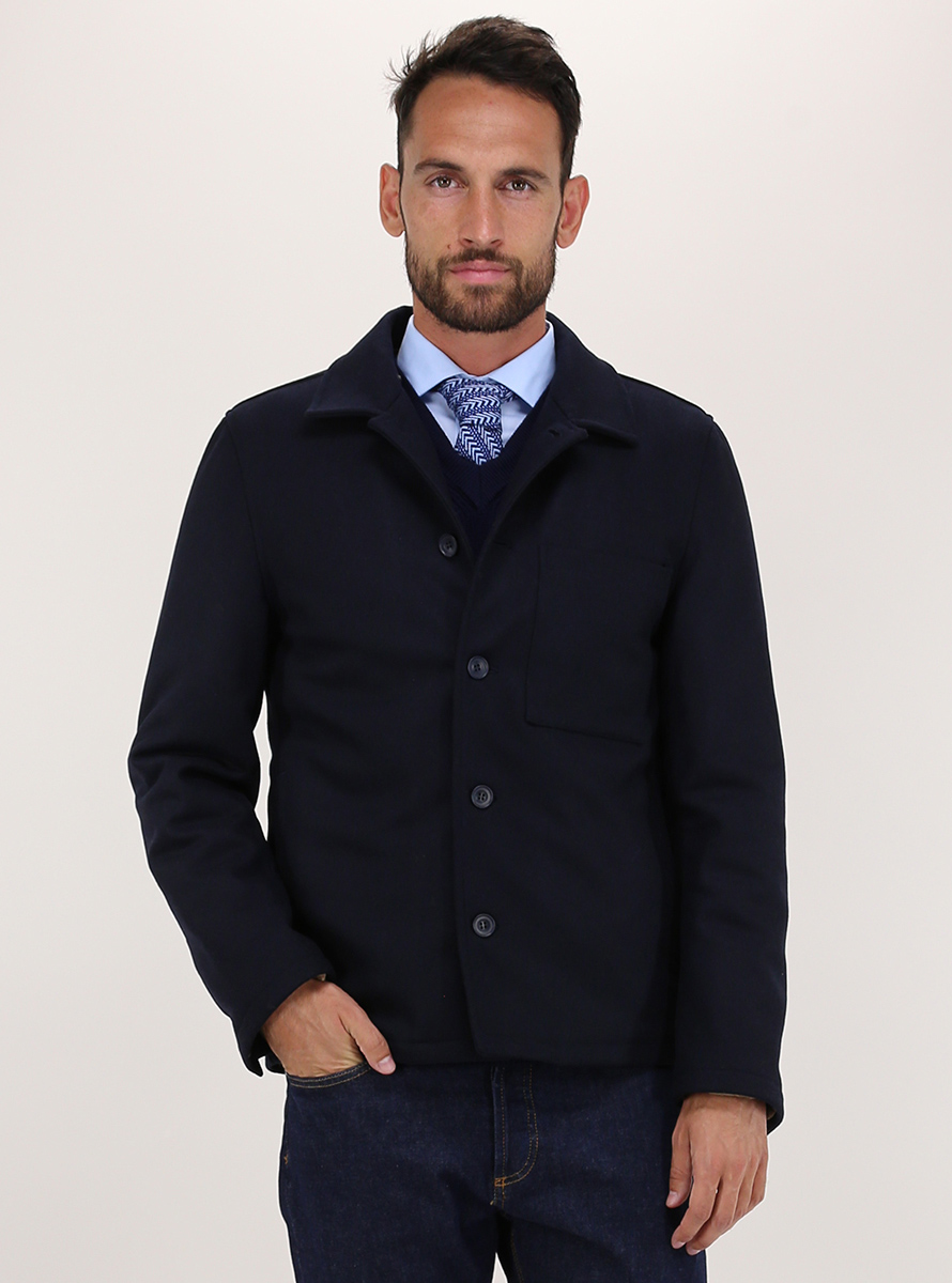 Messagerie jacket in wool blend with internal padding. Long sleeves and welt and patch pockets. Front closure buttons and sleeves. The model is 1.80 tall and wears size M.