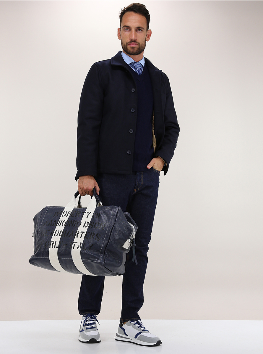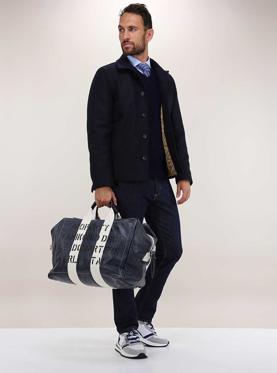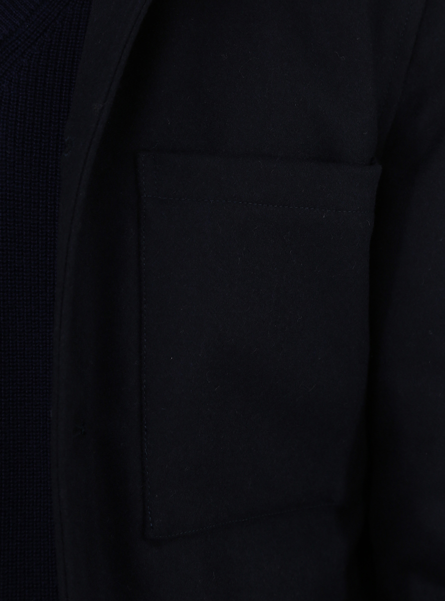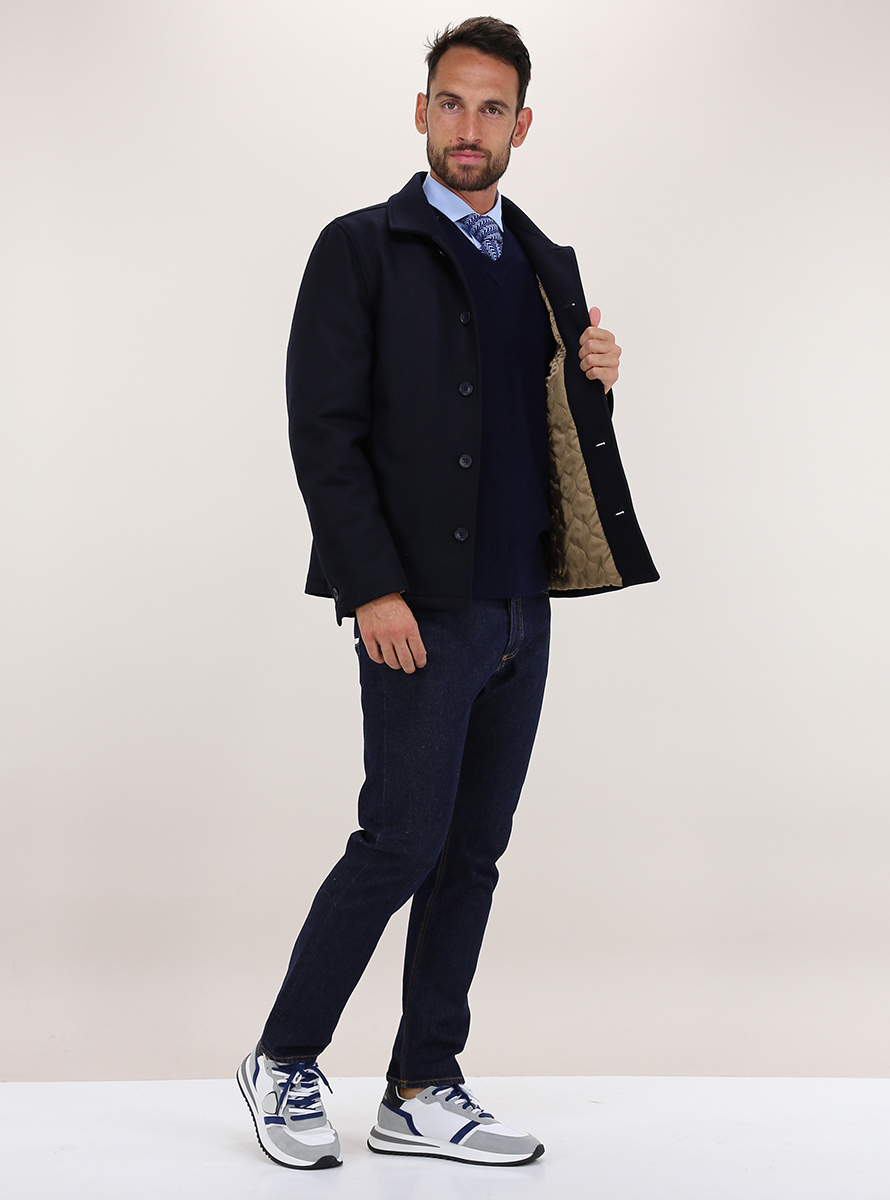 Messagerie jacket in wool blend with internal padding. Long sleeves and welt and patch pockets. Front closure buttons and sleeves. The model is 1.80 tall and wears size M.
